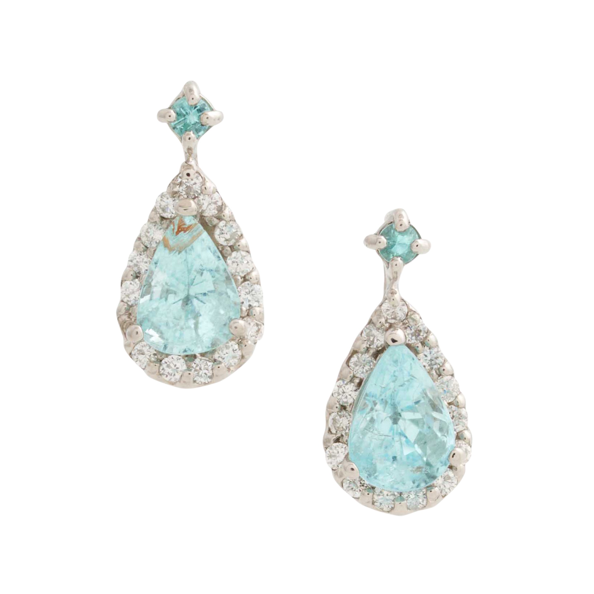 Of cluster design, each earring comprises of a centred claw set pear-cut tourmaline within a claw set surround of claw-set diamonds from a drop of a single claw-set paraiba tourmaline, the tourmalines together weighing approximately 1.38 carats, the diamonds together weighing approximately 0.22 carats, to post and butterfly fittings, length 15mm, gross weight approximately 2.90 grams.