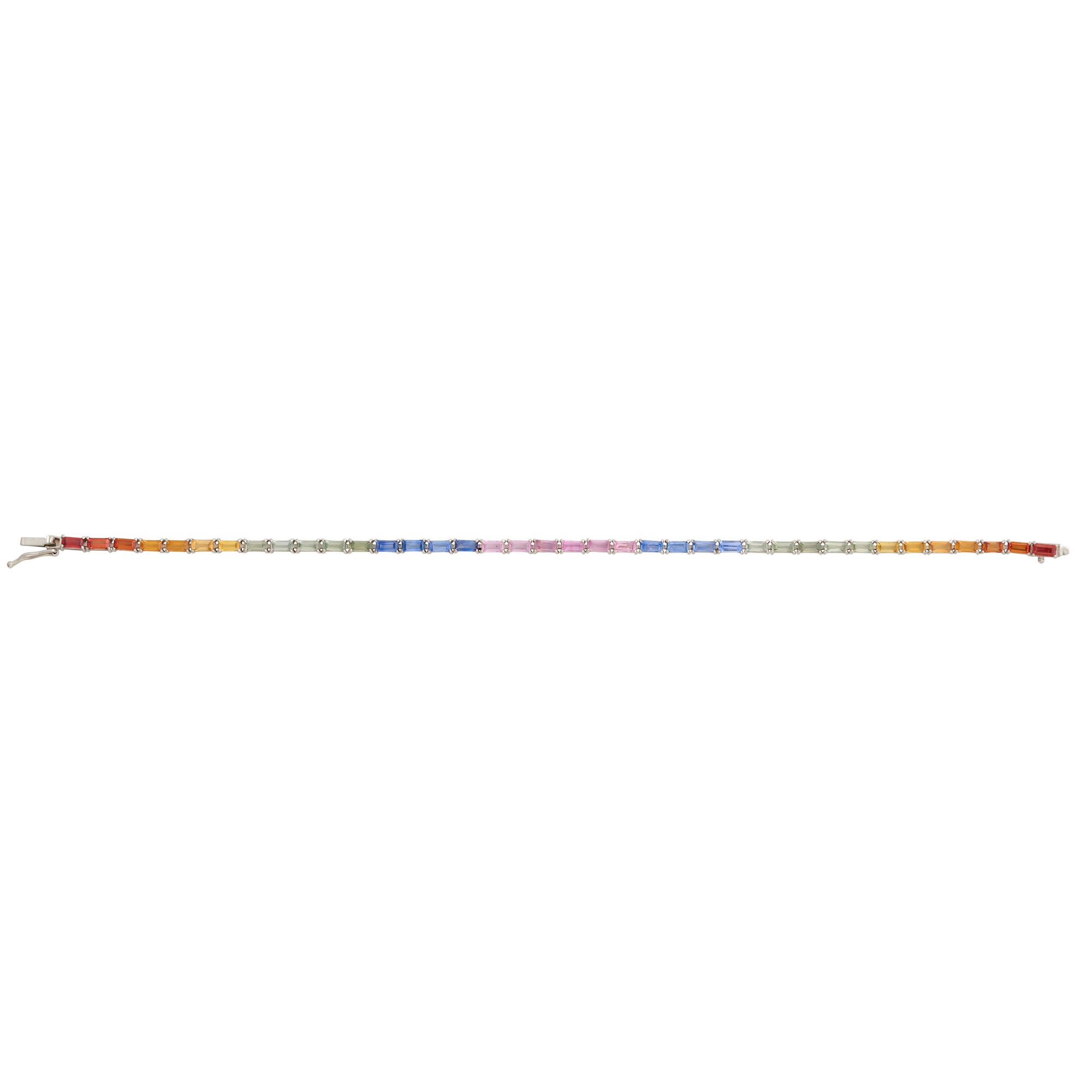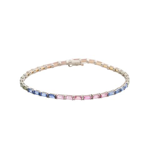 Modelled as a continuous line of colour blended claw-set sapphires together weighing 5.30 carats, completed by a concealed tongue and groove clasp, length approximately 180mm, gross weight approximately 6.3 grams.