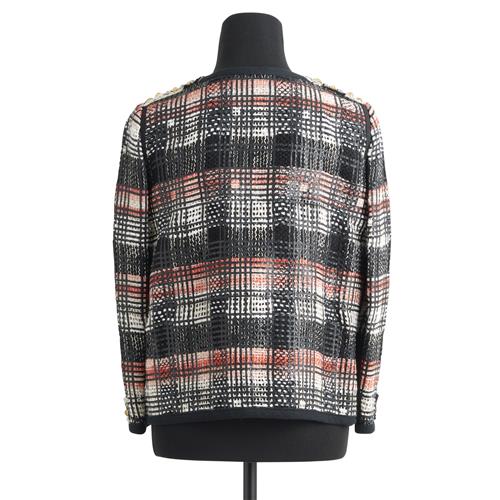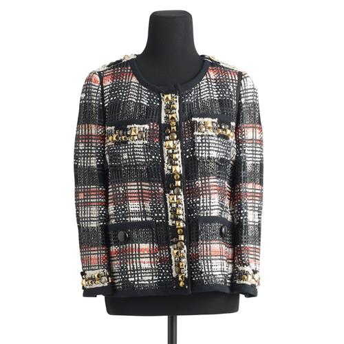 Styled in black white and peach tweed with black corded wool trim, featuring multi tone hardware studed details to shoulders, closure and two breast pockets, marked size 42.