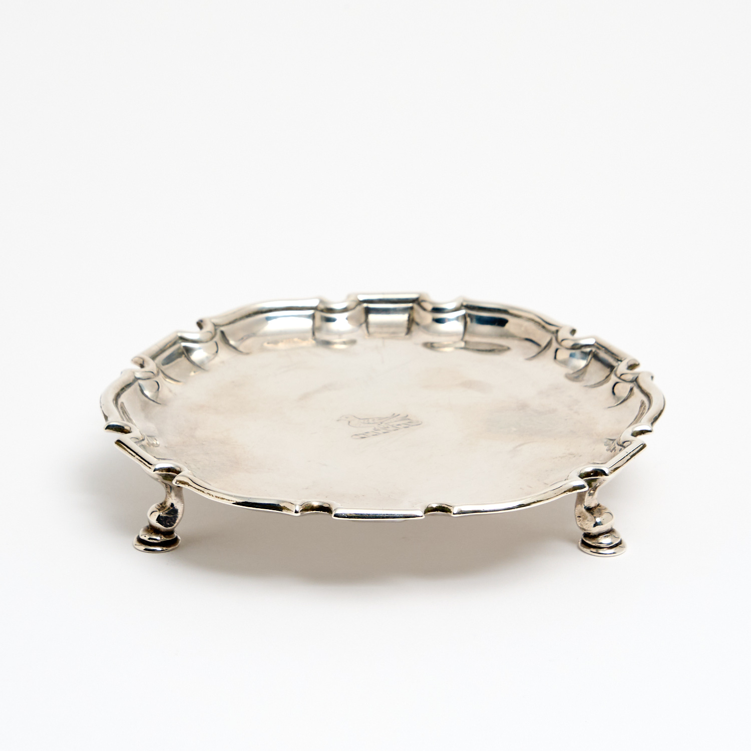 A SMALL GEORGE II–EARLY GEORGE III STERLING SILVER SALVER, UNIDENTIFIED MAKER AND DATES (MARKS RUBBED), 264G DIA.15CM