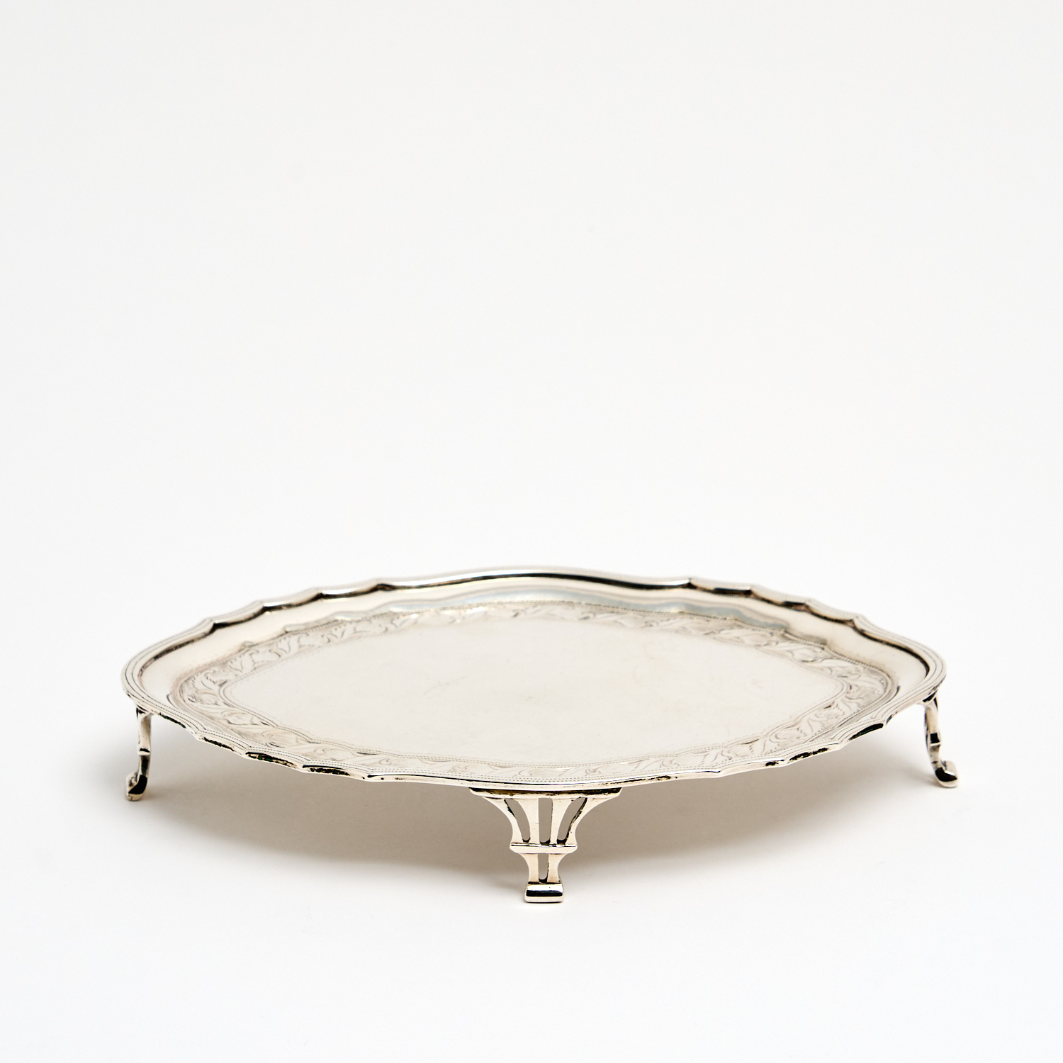 A SMALL GEORGE III STERLING SILVER SALVER, PROBABLY WILLIAM & PATRICK CUNNINGHAM, EDINBURGH, CIRCA 1800 (MARKS RUBBED),155G L.18CM