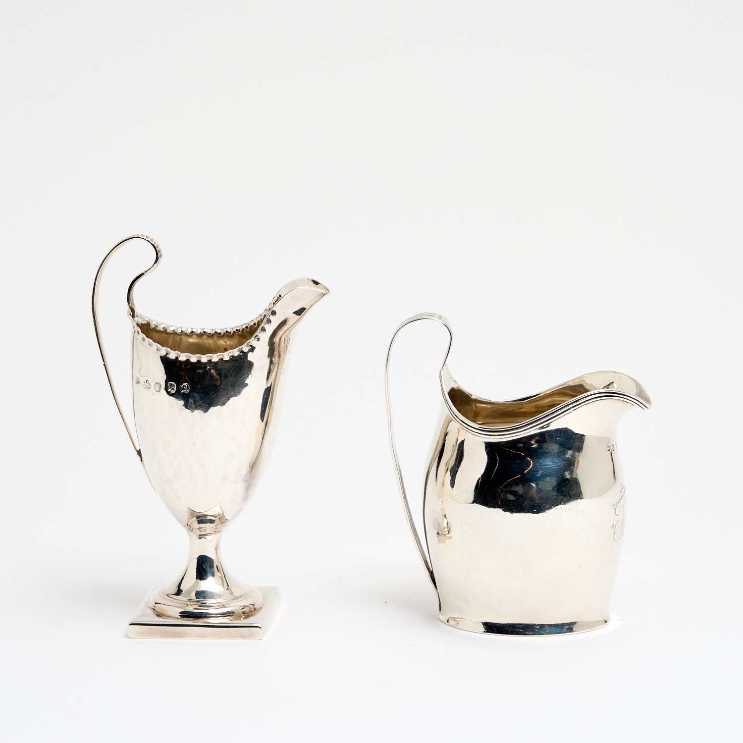 TWO GEORGE III STERLING SILVER CREAM JUGS, UNIDENTIFIED MAKERS, LONDON, 1797 AND 1785 RESPECTIVELY, 190G TOTAL H.14CM (TALLEST)