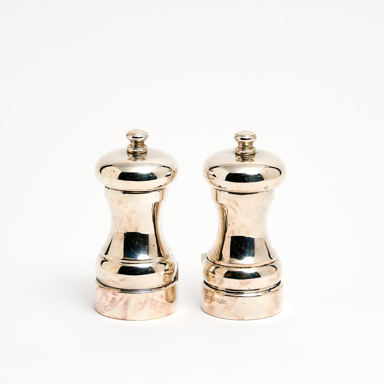 A PAIR OF ELIZABETH II STERLING SILVER SALT AND PEPPER GRINDERS, UNIDENTIFIED MAKER ‘RHS', LONDON, 1990, 291G (TOTAL ,INCLUDING NON SILVER PARTS) H.10CM