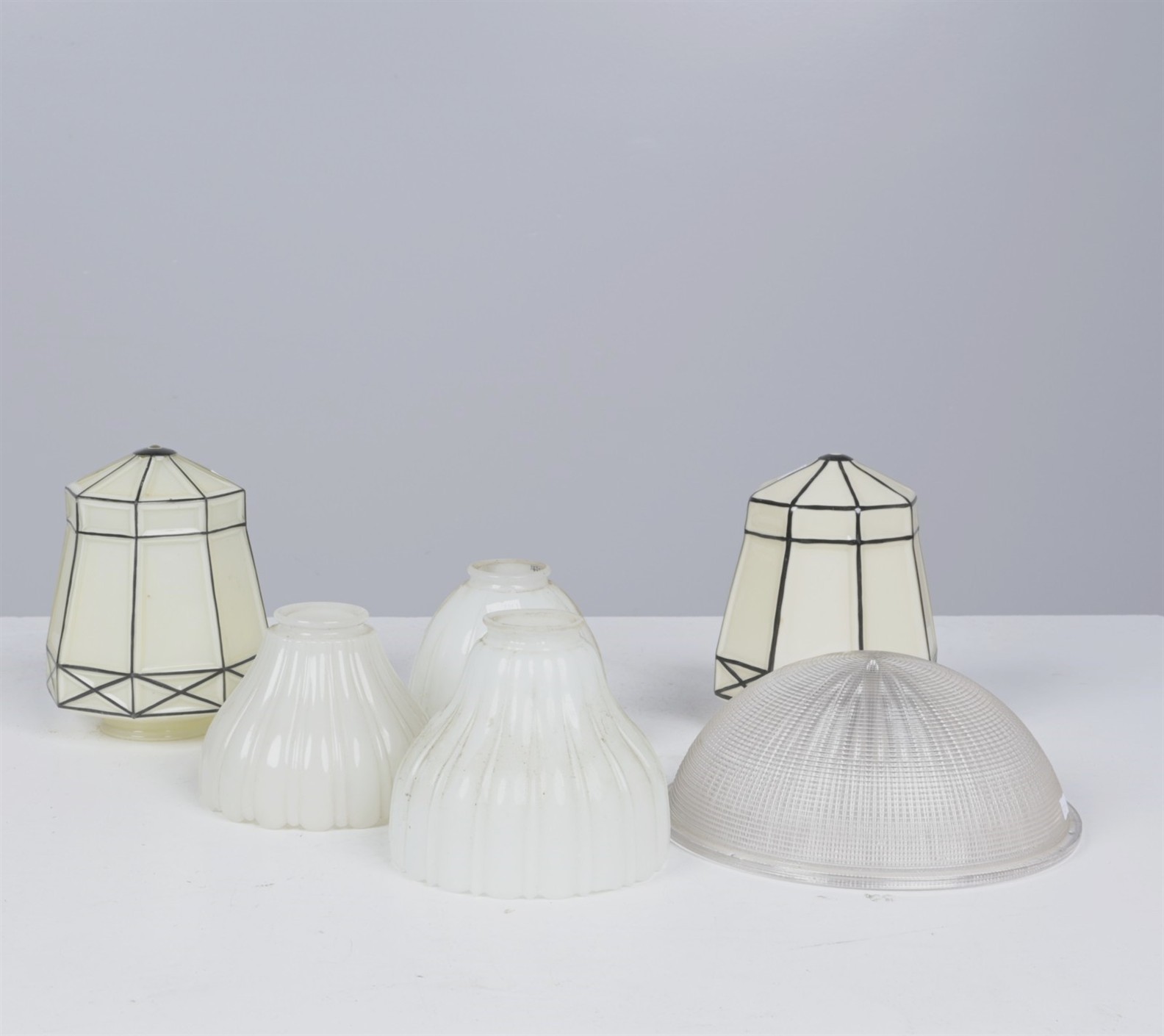 A GROUP OF SIX ART DECO GLASS LIGHT SHADES (13CM H X 25CM DIA)