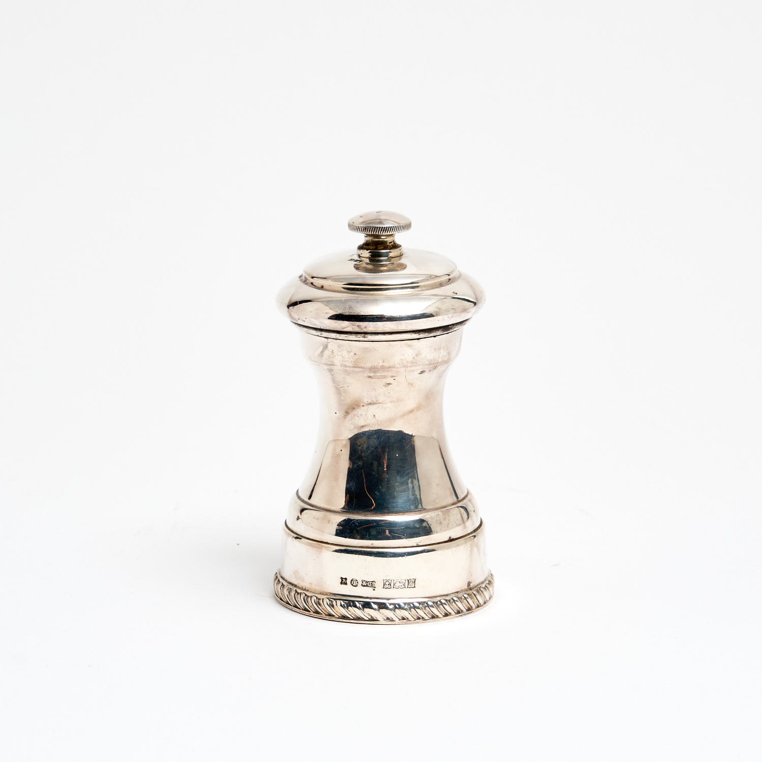 AN ELIZABETH II STERLING PEPPER GRINDER, A. MARSTON & CO., BIRMINGHAM, 1971, 212G TOTAL (INCLUDING NON-SILVER PARTS) H.10CM