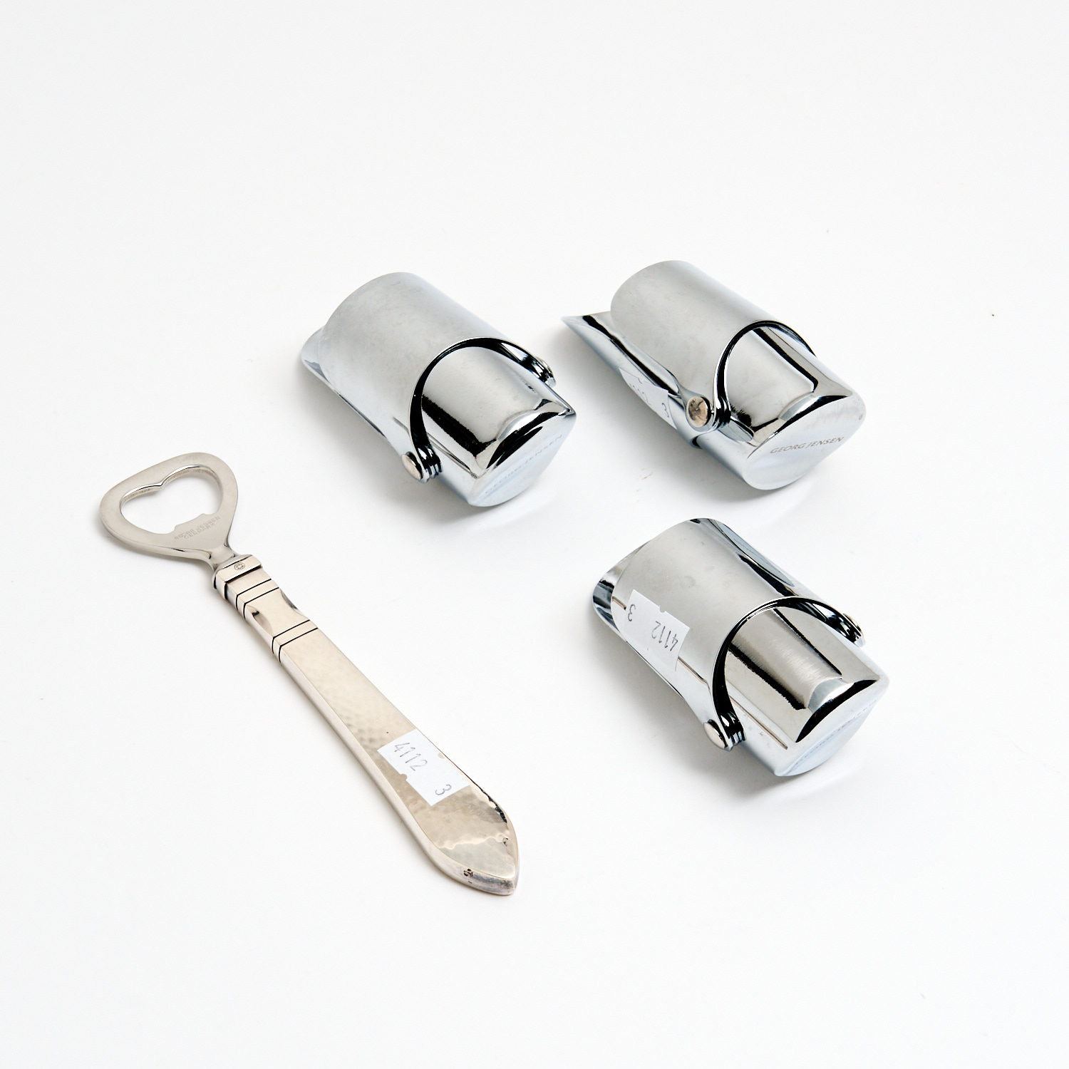 THREE GEORG JENSEN CHAMPAGNE STOPPERS AND A GEORG JENSEN STERLING SILVER BOTTLE OPENER L.16.5CM