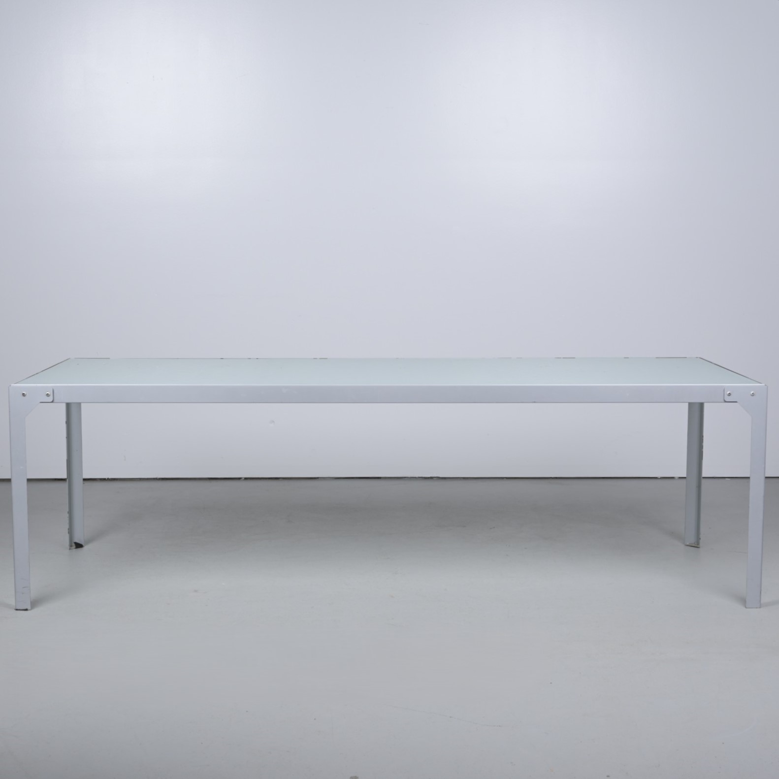 A CONTEMPORARY GLASS TOP DINING TABLE (73CM H X 241CM W X 92CM D) (THIS ITEM MUST BE REMOVED BY PROFESSIONAL CARRIERS OR CLIENTS. LEONARD JOEL STAFF CANNOT ASSIST WITH CARRYING OR DELIVERY OF THIS ITEM)