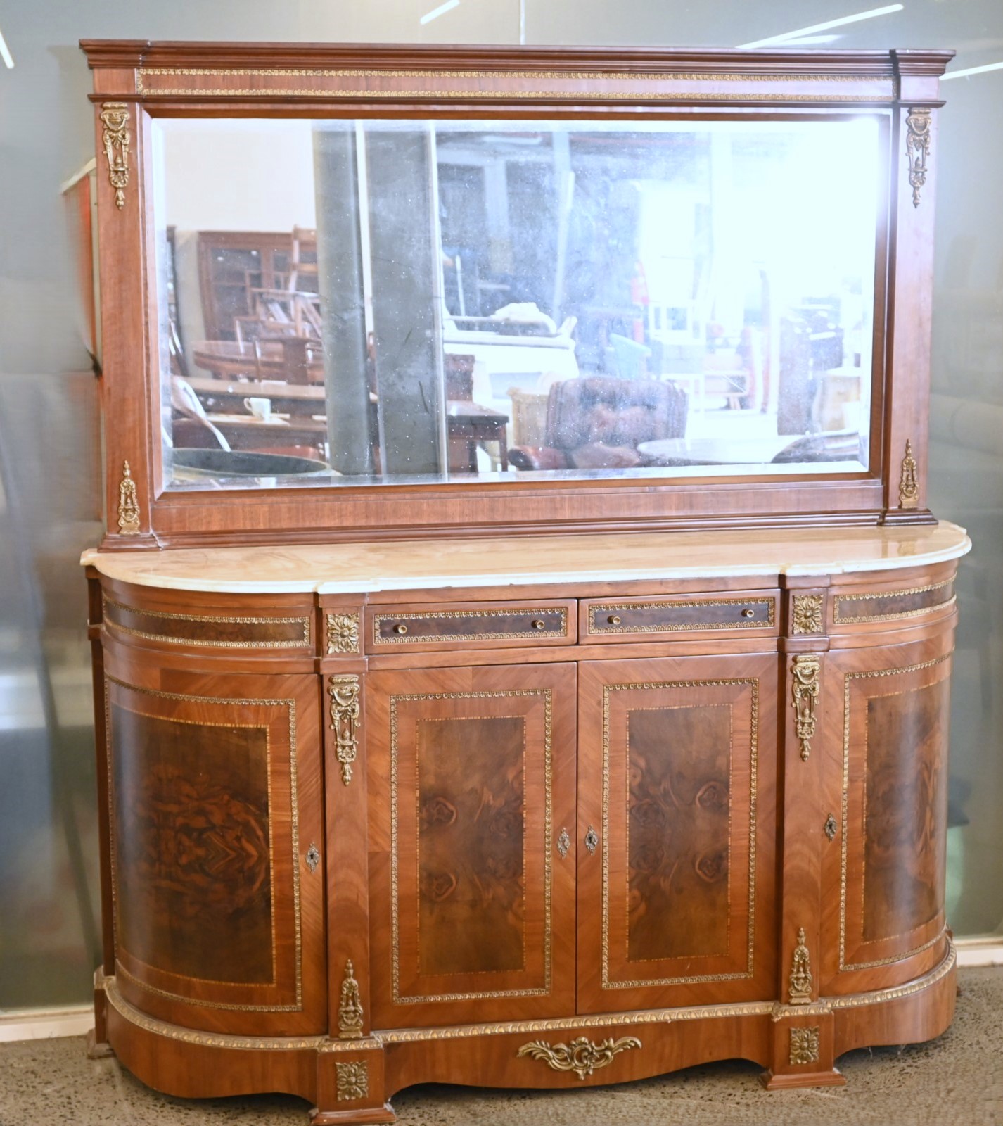A LARGE MIRROR-BACKED AND MARBLE-TOPPED WALNUT SIDEBOARD IN ANTIQUE MANNER (205CM H X 188CM W X 55CM D) (THIS ITEM MUST BE REMOVED BY PROFESSIONAL CARRIERS OR CLIENTS. LEONARD JOEL STAFF CANNOT ASSIST WITH CARRYING OR DELIVERY OF THIS ITEM)