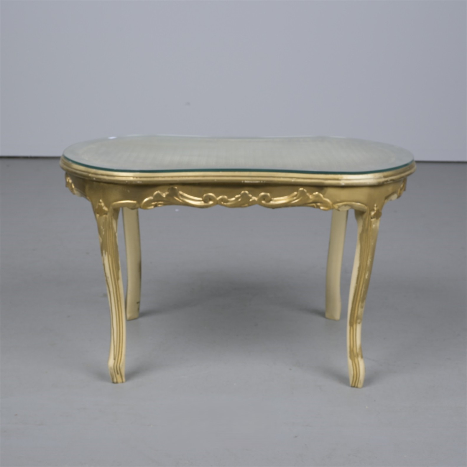 A GOLD-PAINTED LOW SIDE TABLE IN ANTIQUE MANNER, THE CANED TOP WITH A GLASS COVER (46H X 76W X 47D CM)