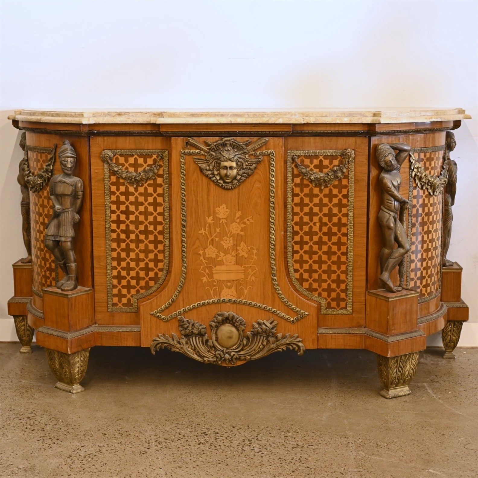 A LARGE MARBLE-TOPPED COMMODE IN LATE LOUIS XV MANNER (97CM H X 173CM W X 61CM D) (THIS ITEM MUST BE REMOVED BY PROFESSIONAL CARRIERS OR CLIENTS. LEONARD JOEL STAFF CANNOT ASSIST WITH CARRYING OR DELIVERY OF THIS ITEM)