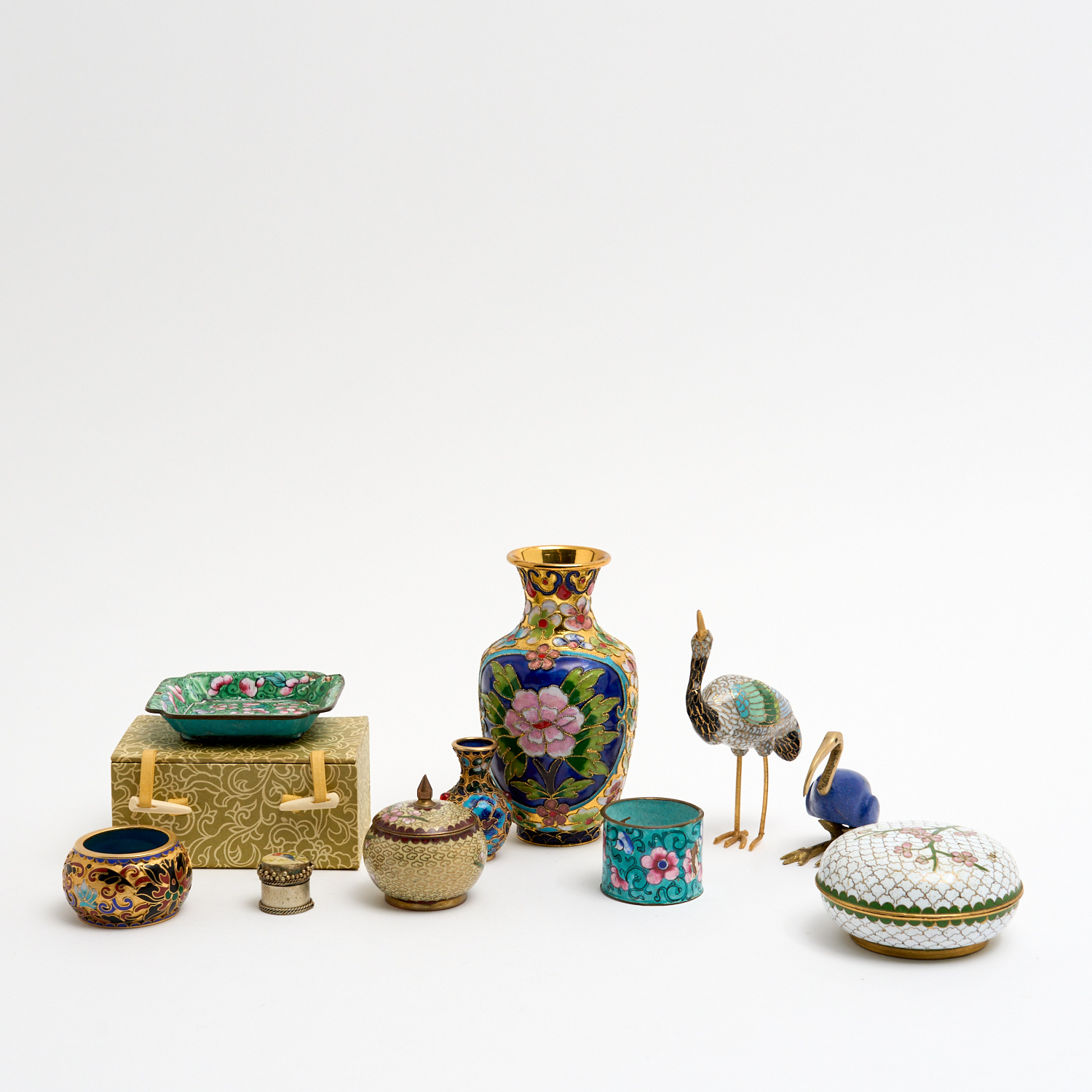 A GROUP OF CLOISONNE AND SEMI PRECIOUS STONE PIECES INCLUDING TWO IBIS, SMALL VASES, TRINKET BOXES AND A PERFUME BOTTLE H,