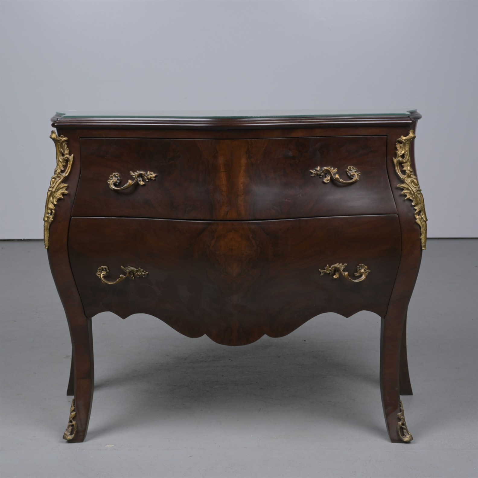 A LOUIS XV-STYLE BOMBE COMMODE, THE TOP WITH A GLASS COVER (82H X 103W X 50D CM) (THIS ITEM MUST BE REMOVED BY PROFESSIONAL CARRIERS OR CLIENTS. LEONARD JOEL STAFF CANNOT ASSIST WITH CARRYING OR DELIVERY OF THIS ITEM)