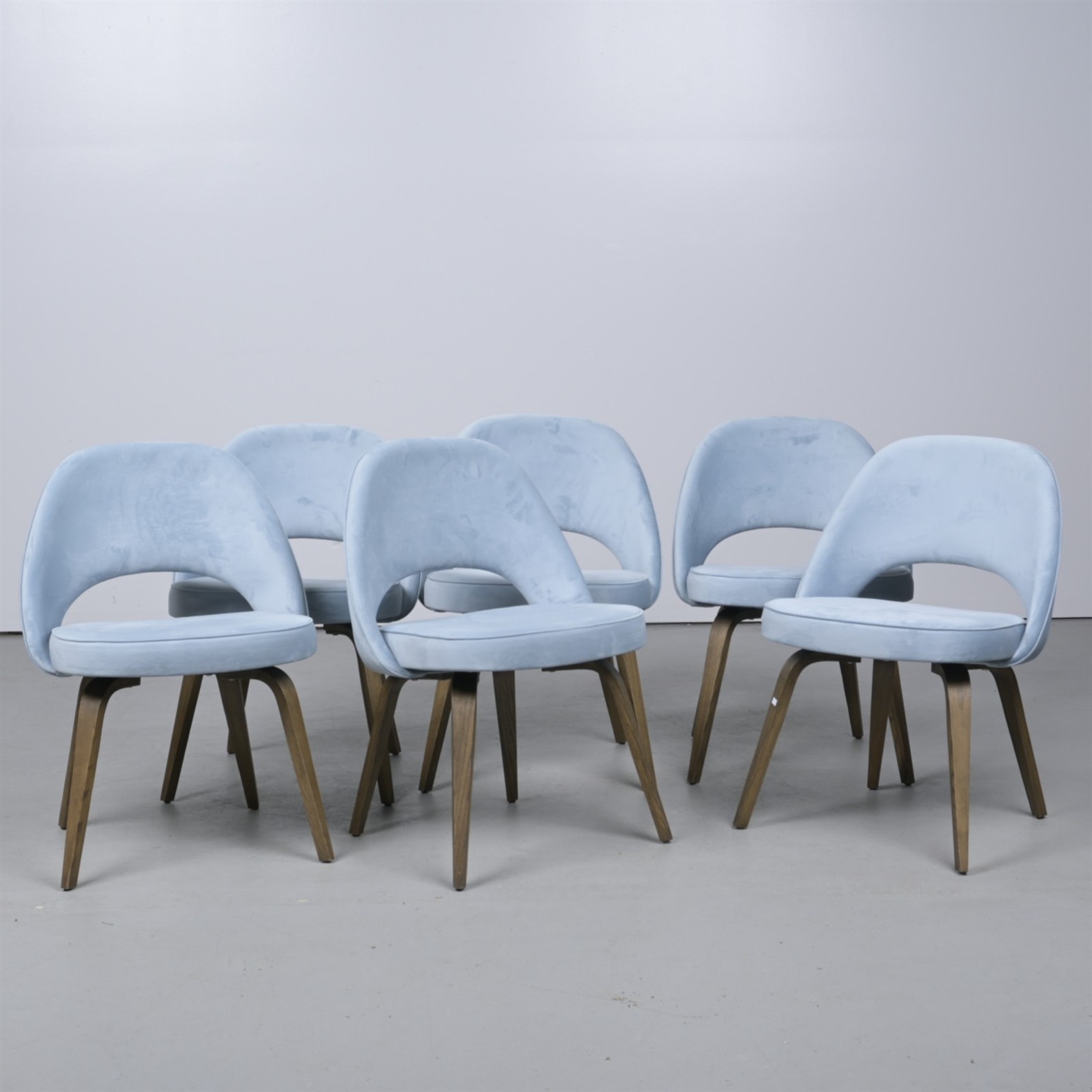 A SET OF SIX UPHOLSTERED DINING CHAIRS IN THE MANNER OF EERO SAARINEN EXECUTIVE CHAIR (79CM H X 51CM W X 51CM D)