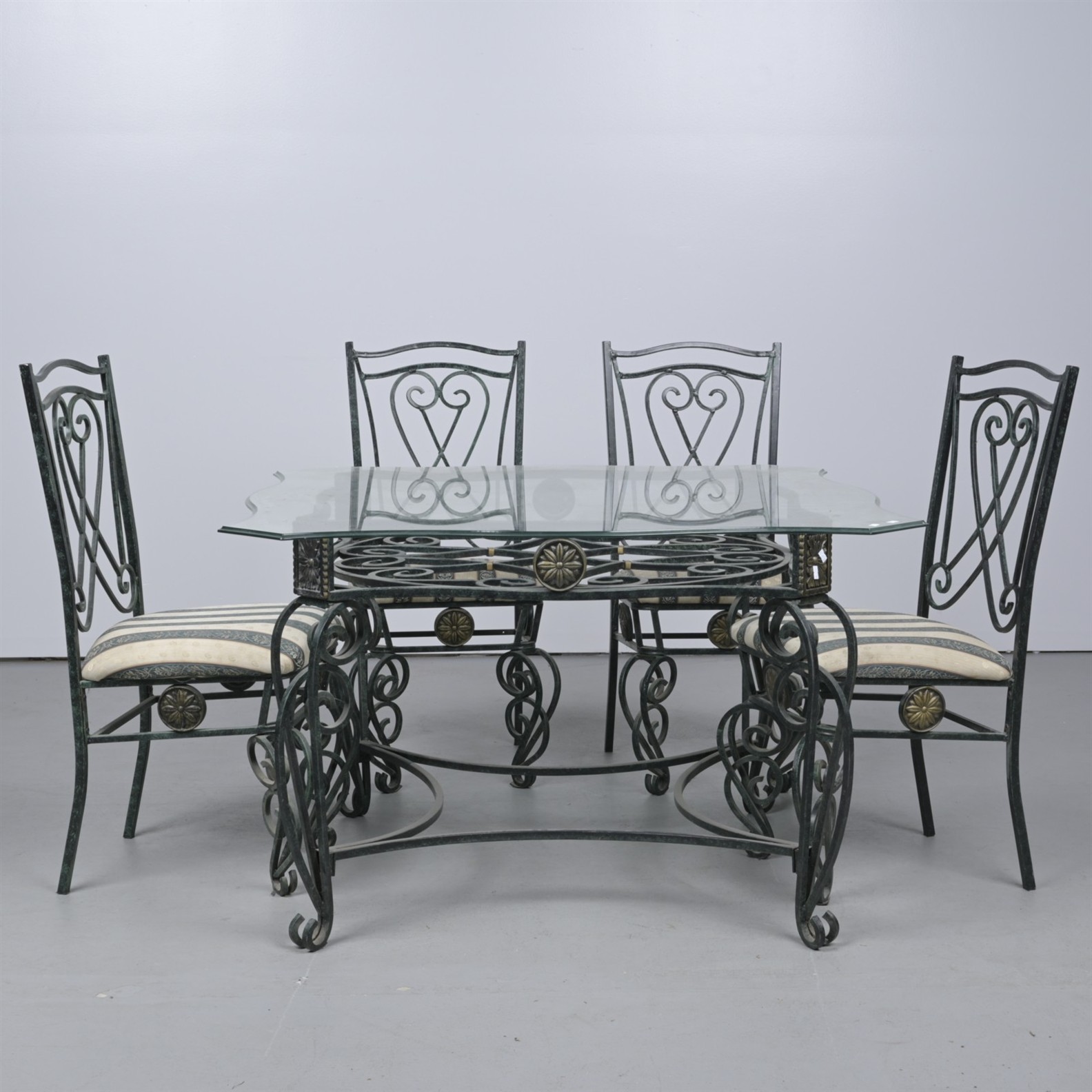 A METAL OUTDOOR SETTING INCLUDING A TABLE AND FOUR CHAIRS (74CM H X 115CM W X 115CM D) (THIS ITEM MUST BE REMOVED BY PROFESSIONAL CARRIERS OR CLIENTS. LEONARD JOEL STAFF CANNOT ASSIST WITH CARRYING OR DELIVERY OF THIS ITEM)