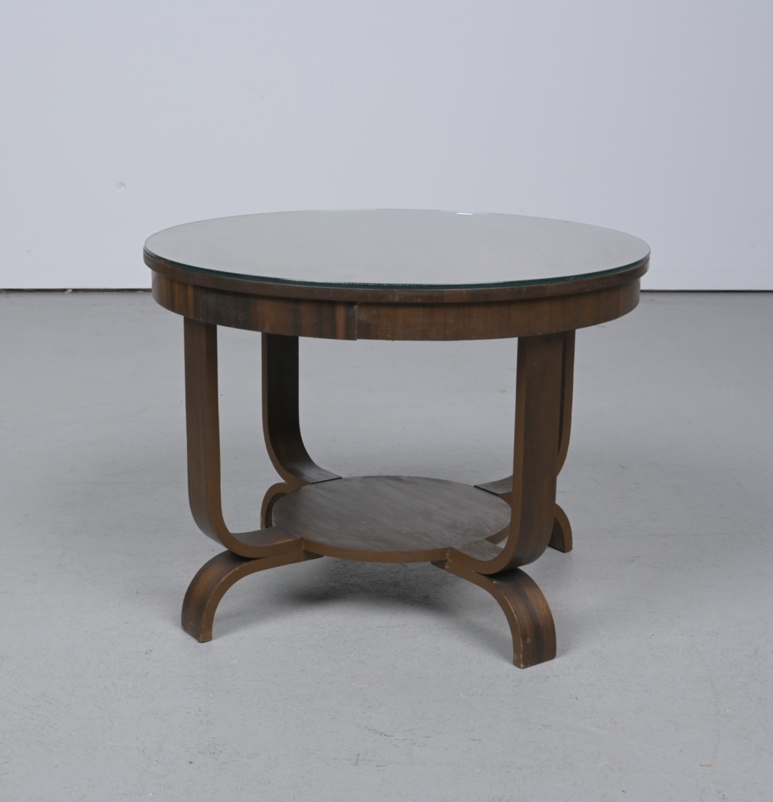 AN ART DECO SIDE TABLE WITH GLASS TOP (45CM H X 60CM DIA)