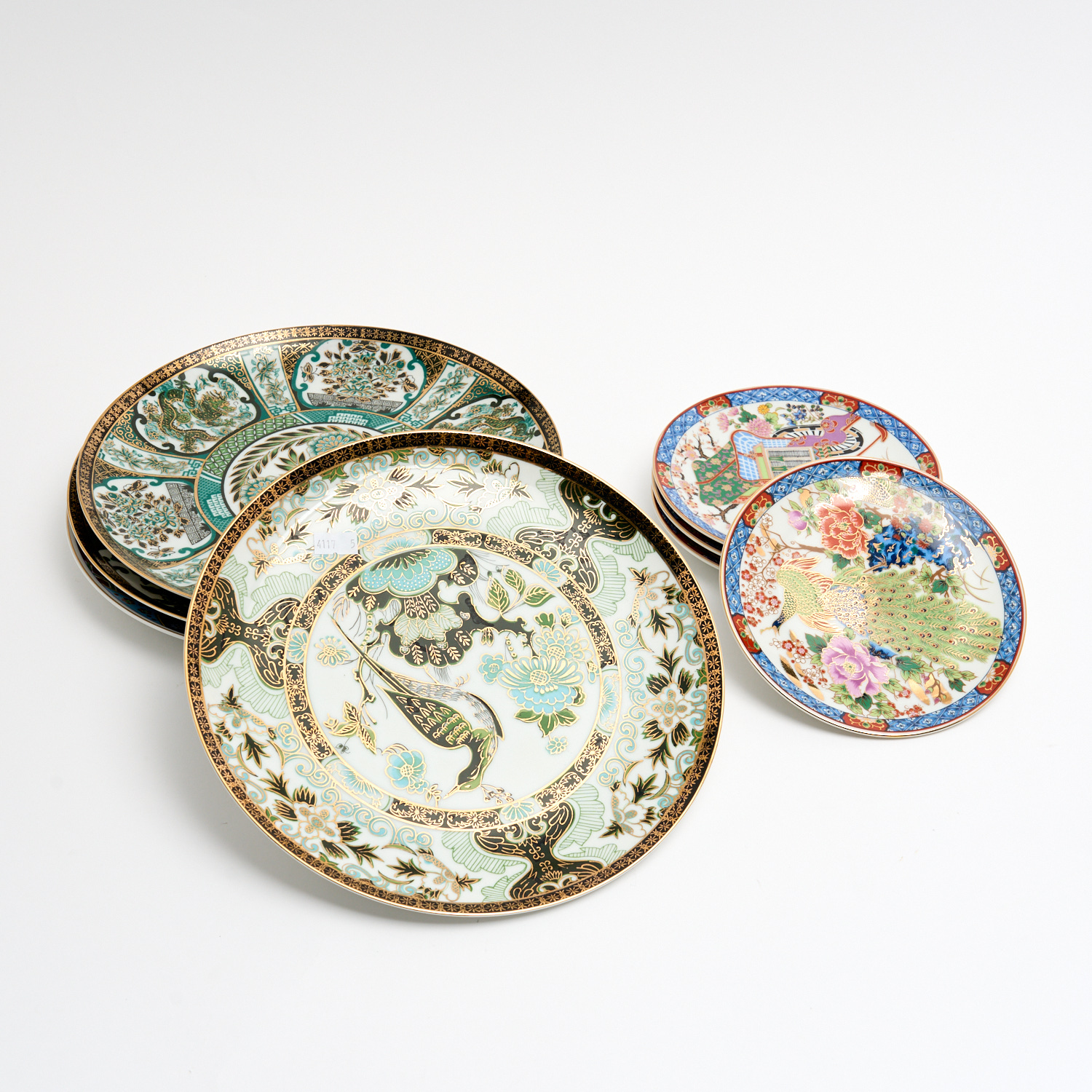 A COLLECTION OF JAPANESE BIRD AND FLOWER DECORATED PORCELAIN INCLUDING 4 LARGE AND 4 SMALL DIA.26CM (LARGEST)