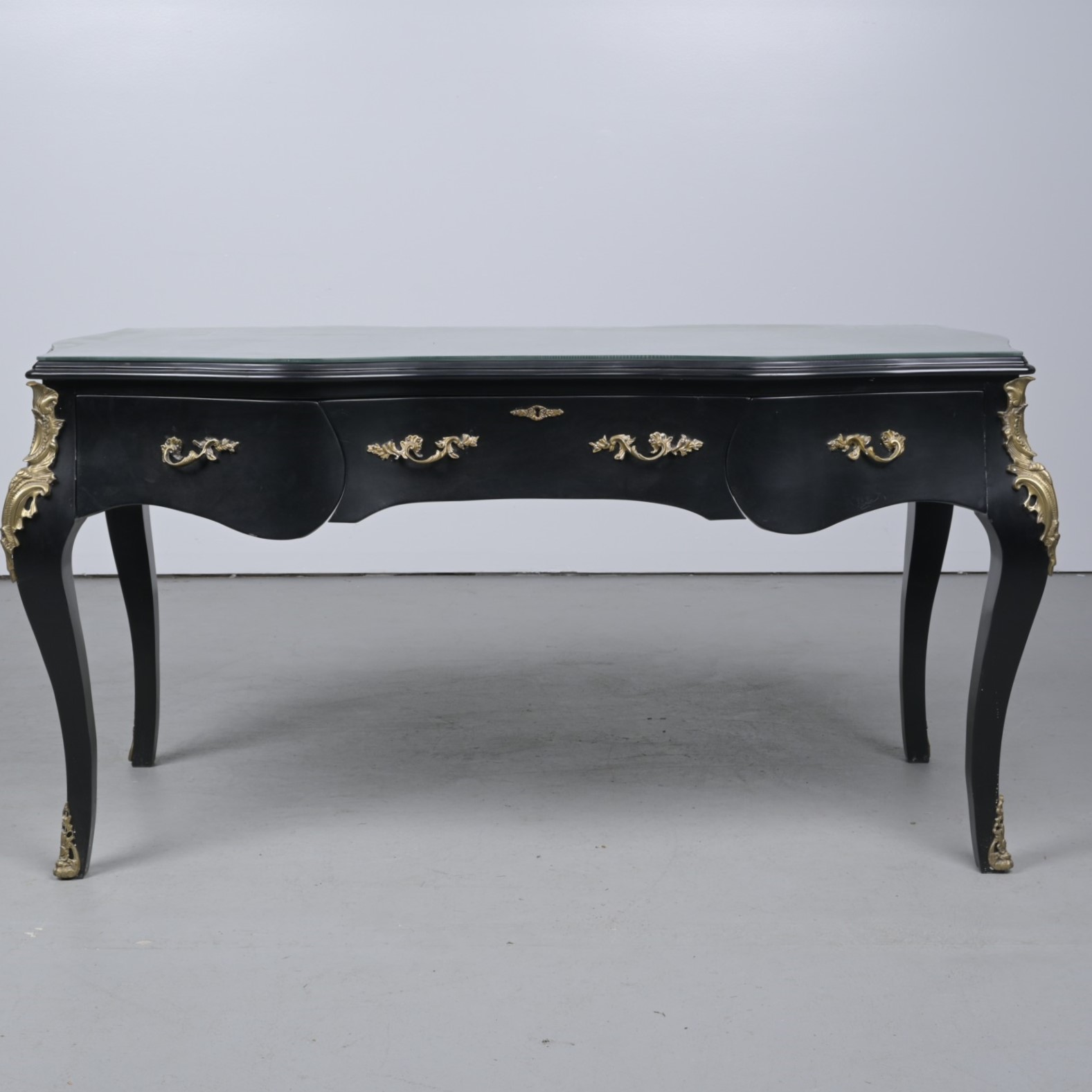 A LOUIS XV-STYLE EBONISED DESK (81CM H X 160CM W X 78CM D) (THIS ITEM MUST BE REMOVED BY PROFESSIONAL CARRIERS OR CLIENTS. LEONARD JOEL STAFF CANNOT ASSIST WITH CARRYING OR DELIVERY OF THIS ITEM)
