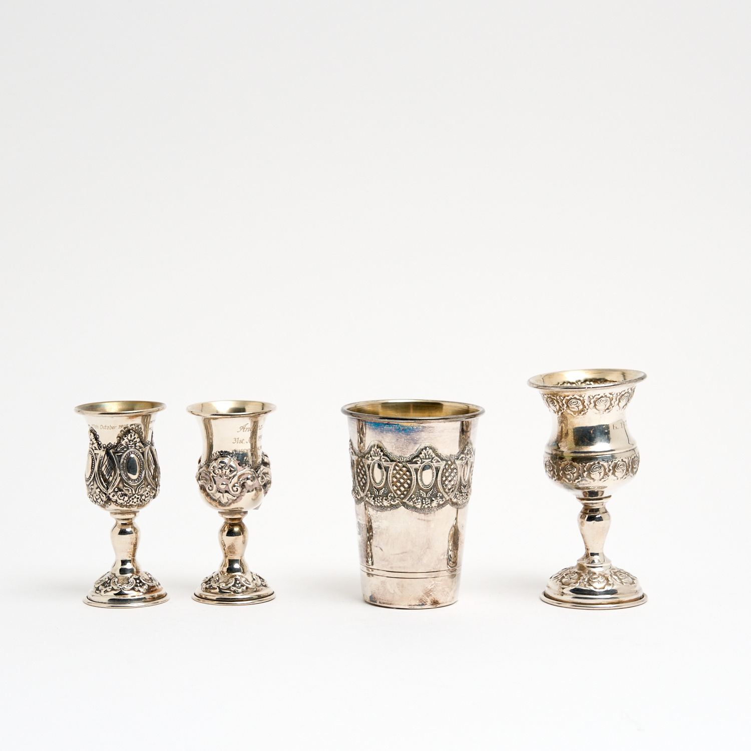 THREE SMALL EMBOSSED STERLING SILVER CUPS TOGETHER WITH A CHRISTENING CUP, ALL WITH GILT-WASHED INTERIORS 182G H.10CM (TALLEST)