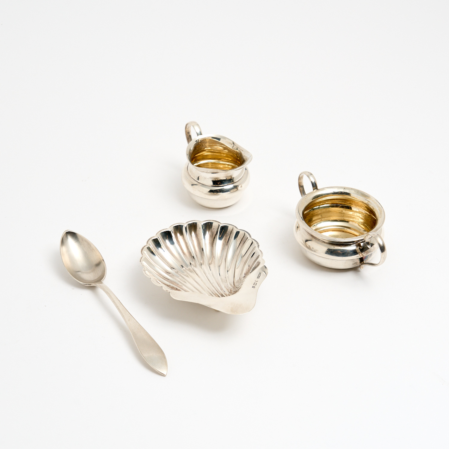 FOUR PIECES OF STERLING SILVER INCLUDING A SMALL TWIN HANDLED CUP, A SMALL BRANDY POURER, SHELL DISH, AND AN 84 SILVER SPOON 134G
