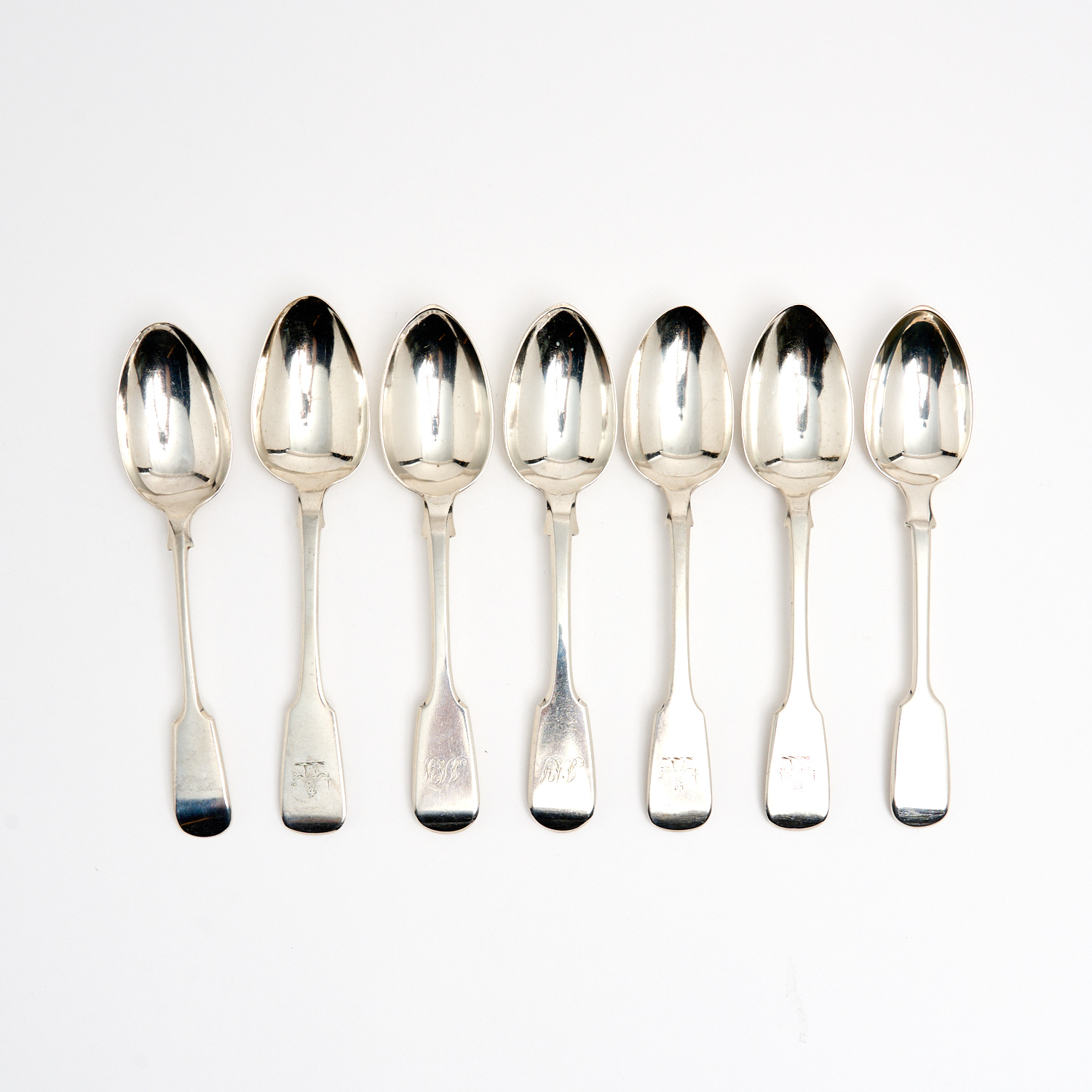 A GROUP OF SEVEN LATE GEORGIAN STERLING SILVER FIDDLE PATTERN SPOONS, THE TERMINALS VARIOUSLY ENGRAVED, VARIOUS MAKERS AND DATES, 330G TOTAL L.17CM (LONGEST)