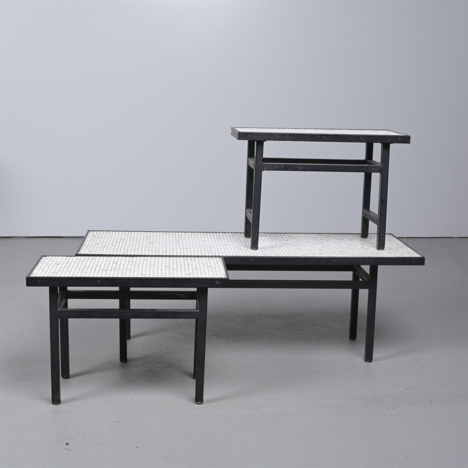 A SET OF THREE TILE-TOPPED COFFEE TABLES (41CM H X 121CM W X 46CM D)