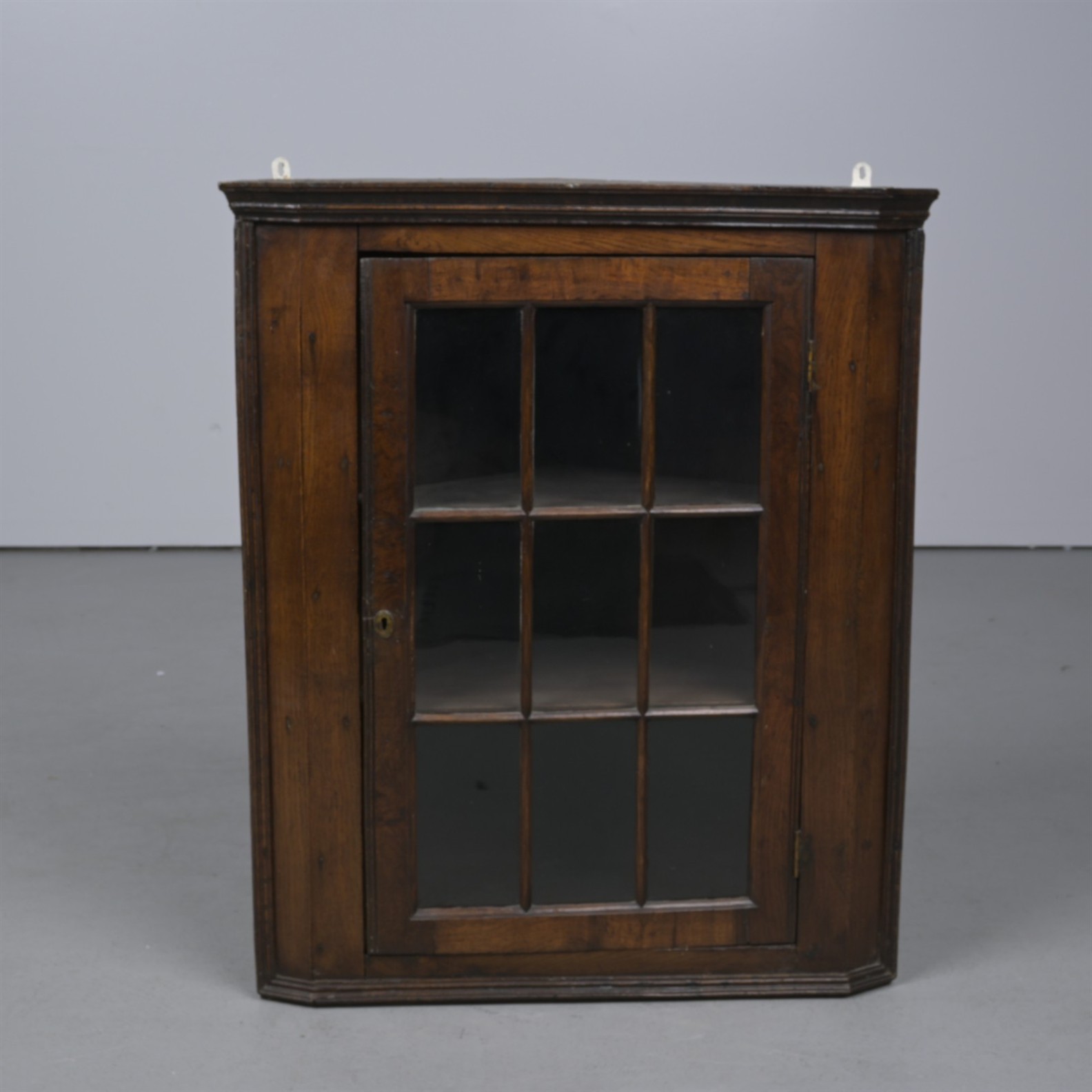 A GEORGE III OAK AND GLAZED HANGING CORNER CABINET (86H X 71W X 37D CM)