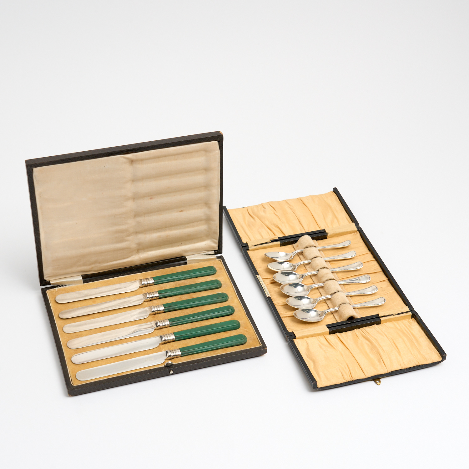 A CASED SET OF STERLING SILVER COFFEE SPOONS TOGETHER WITH A CASED SET OF KNIVES WITH SILVER FERRULES, VARIOUS MAKERS AND DATES, 92G (SPOONS) L.21CM (CASE)