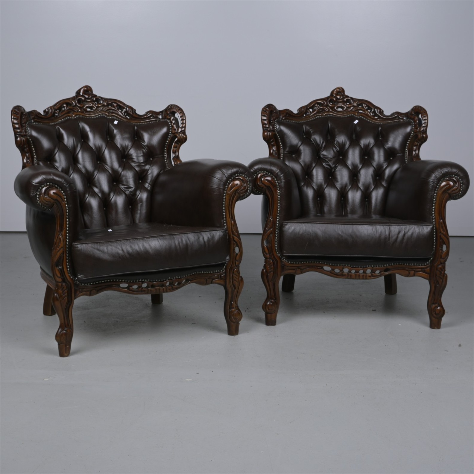A PAIR OF SORTINO LEATHER AND MAHOGANY BUTTON-BACK ARMCHAIRS (97H X 90W X 82D CM) (THIS ITEM MUST BE REMOVED BY PROFESSIONAL CARRIERS OR CLIENTS. LEONARD JOEL STAFF CANNOT ASSIST WITH CARRYING OR DELIVERY OF THIS ITEM)