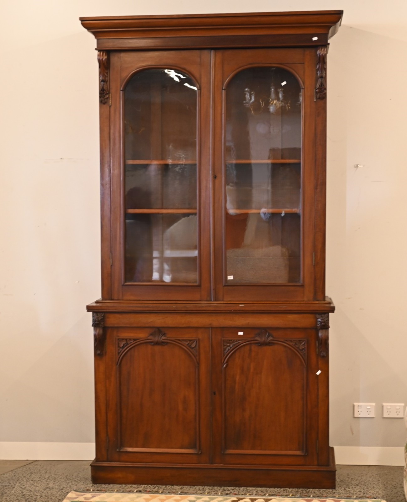 A VICTORIAN AUSTRALIAN CEDAR AND GLAZED BOOKCASE CABINET (A/F) (233CM H X 123CM W X 42CM D) (THIS ITEM MUST BE REMOVED BY PROFESSIONAL CARRIERS OR CLIENTS. LEONARD JOEL STAFF CANNOT ASSIST WITH CARRYING OR DELIVERY OF THIS ITEM)