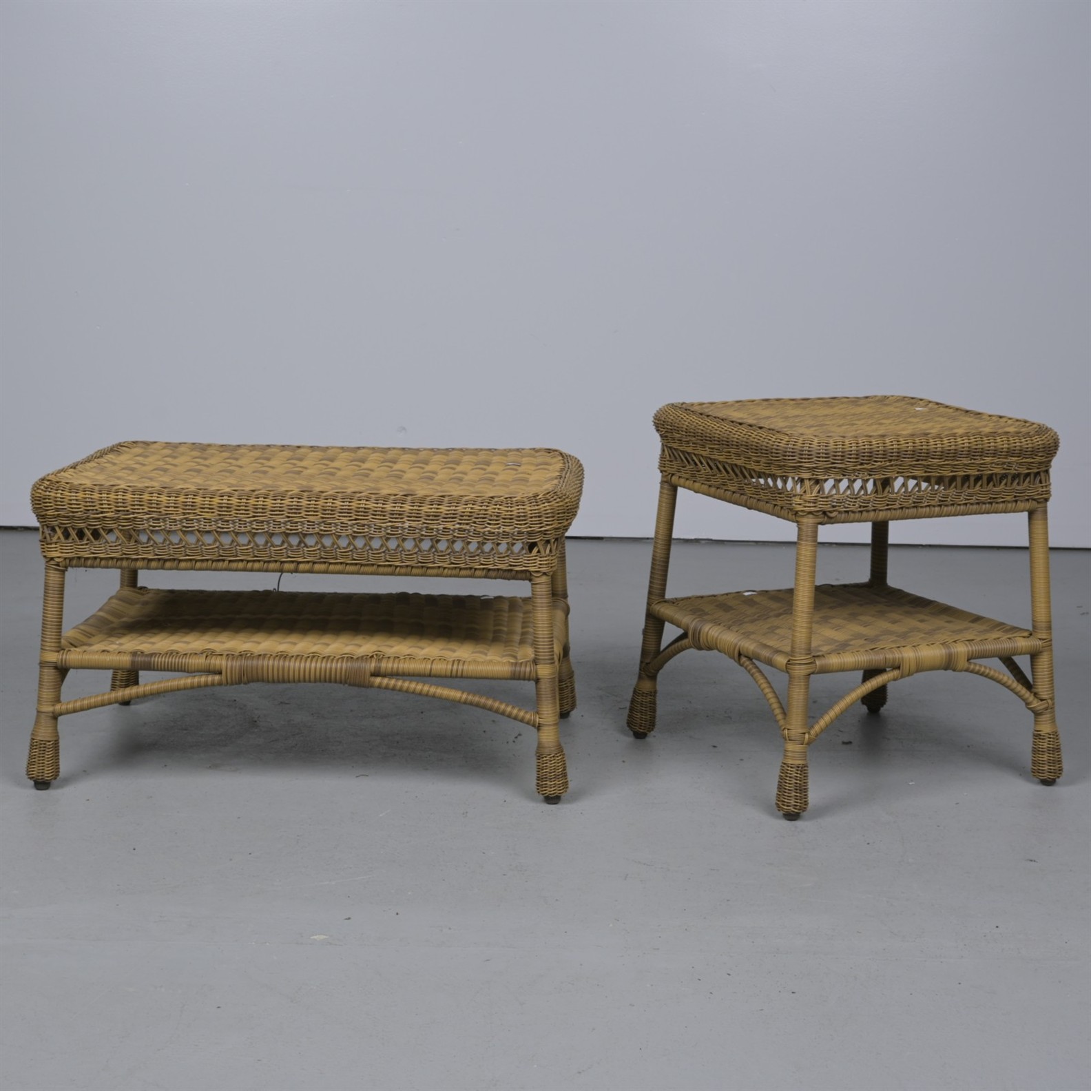 TWO WOVEN CANE SIDE TABLES (48H X 84W X 56D CM, LARGEST)