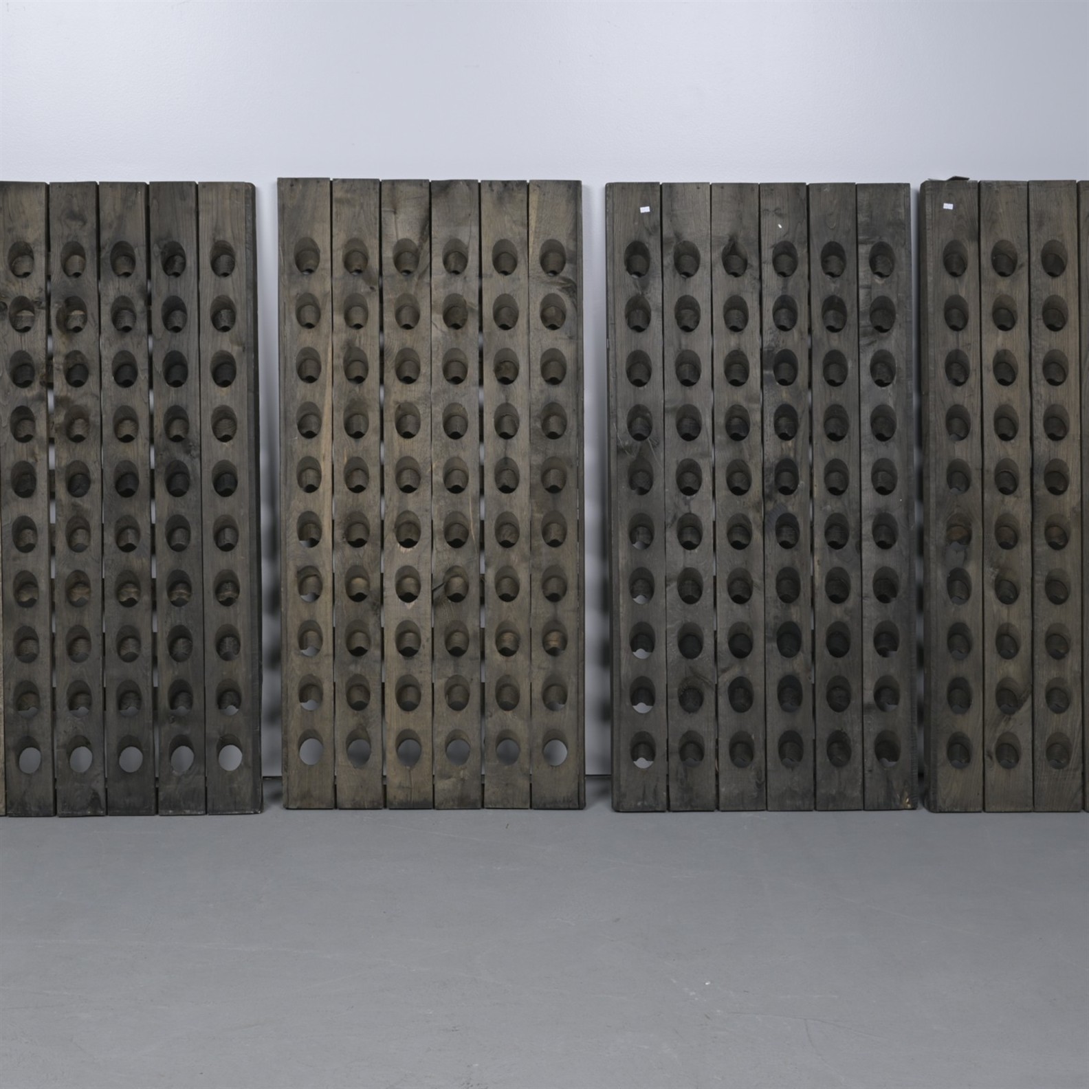 A PAIR OF FRENCH OAK STANDING WINE RACKS (A/F) (151CM H X 73CM W X 6CM D) (THIS ITEM MUST BE REMOVED BY PROFESSIONAL CARRIERS OR CLIENTS. LEONARD JOEL STAFF CANNOT ASSIST WITH CARRYING OR DELIVERY OF THIS ITEM)