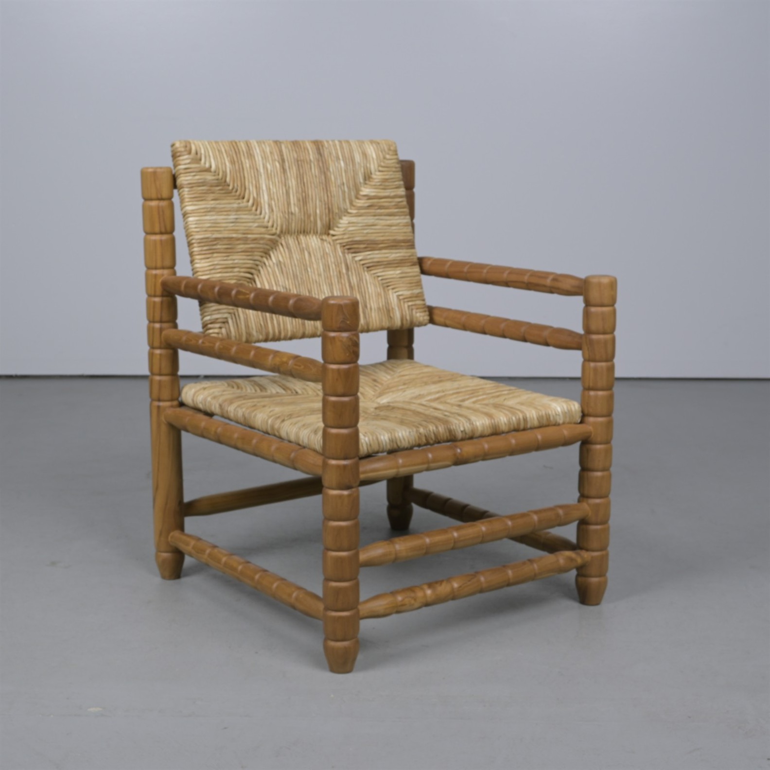 A TEAK AND RUSH ARMCHAIR (85H X 62W X 66D CM)