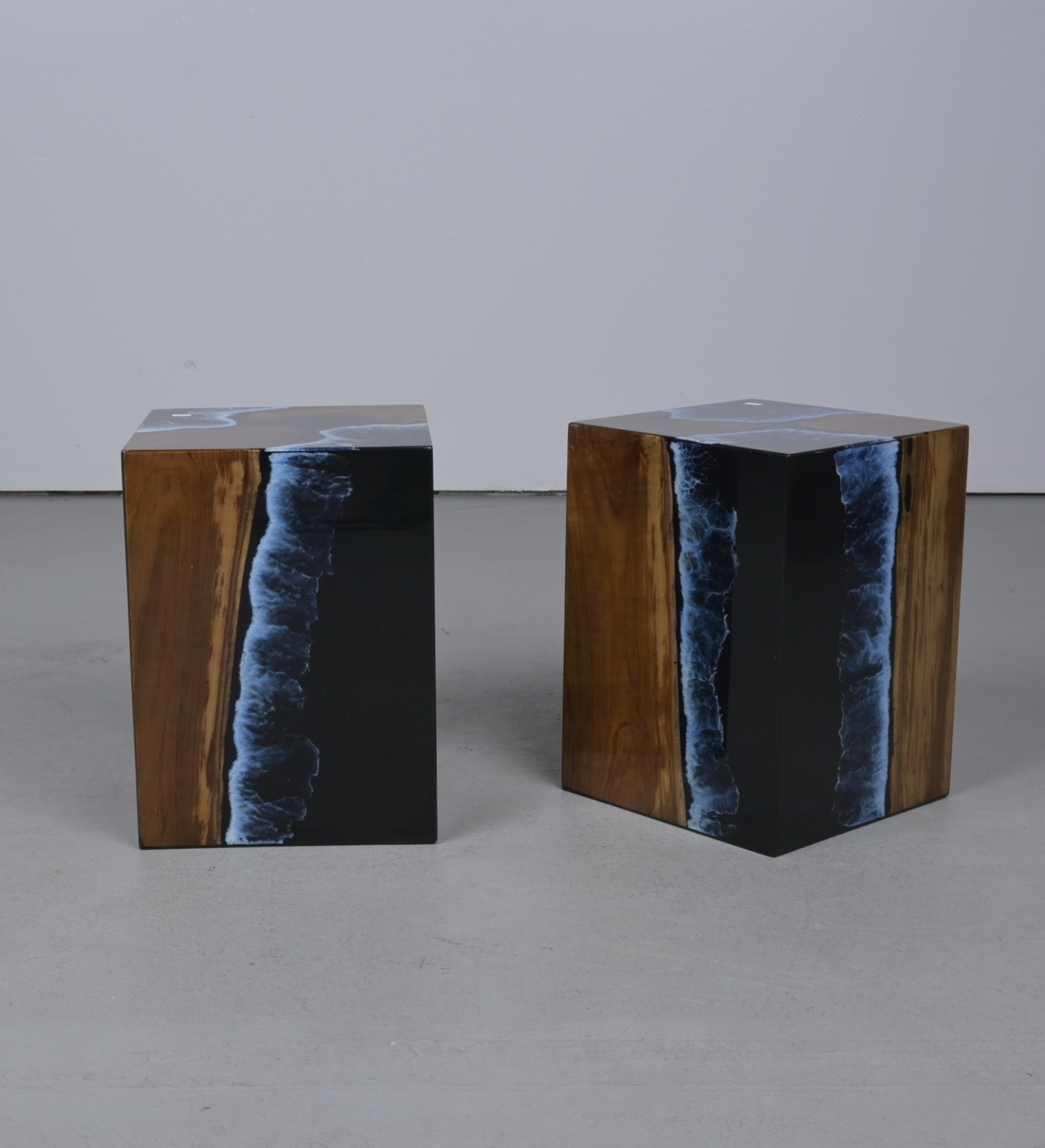A PAIR OF TEAK AND RESIN SIDE TABLES (45CM H X 33CM W X 33CM D)