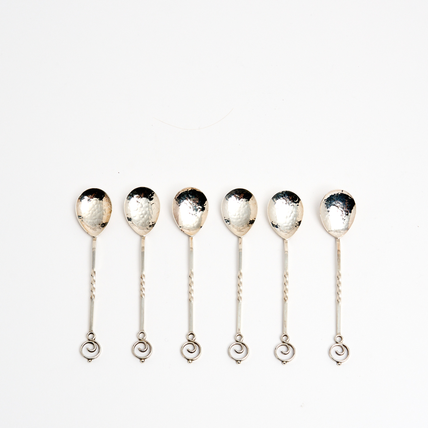 A SET OF SIX AUSTRALIAN STERLING SILVER COFFEE SPOONS IN ARTS AND CRAFTS MANNER, SARGISON, HOBART, SECOND QUARTER 20TH CENTURY, 49G L.10CM