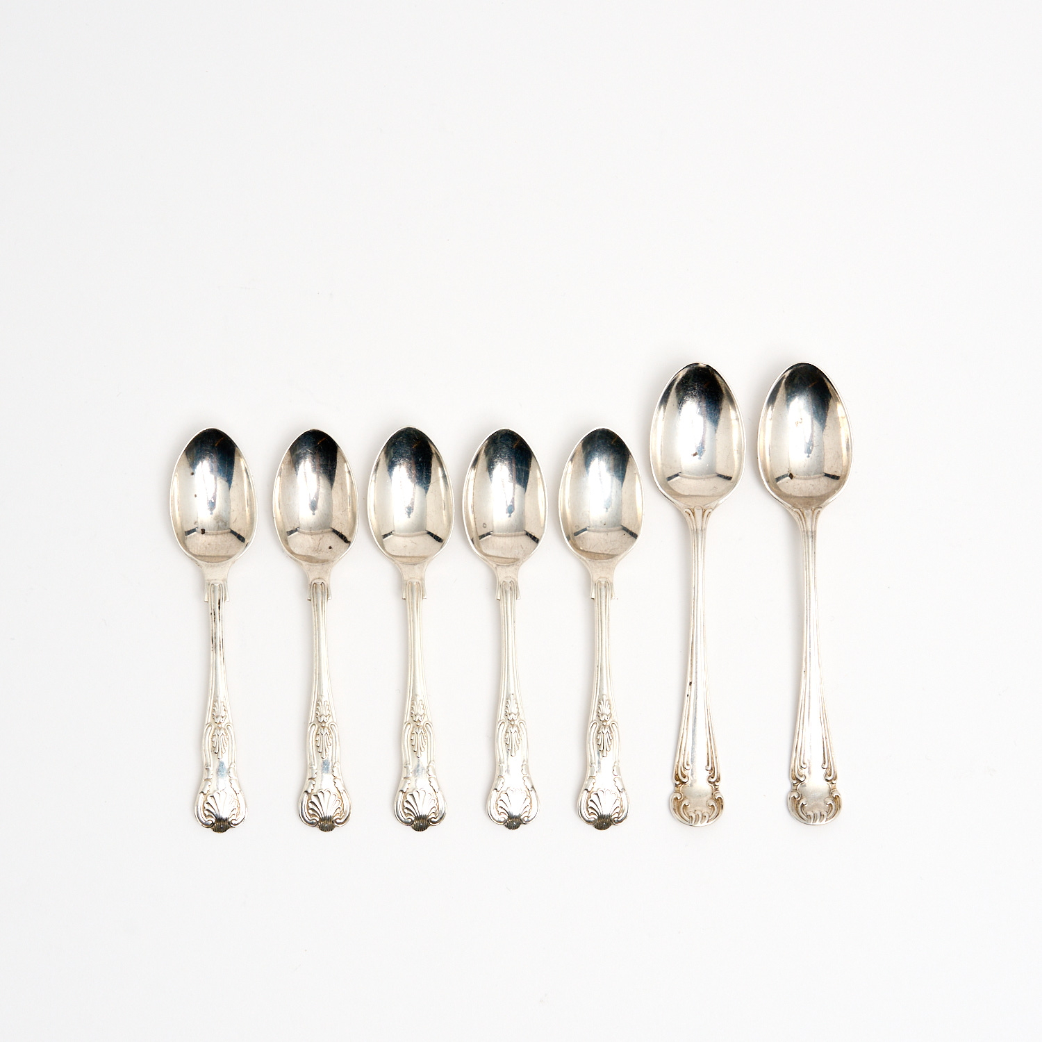 A SET OF FIVE GEORGE VI STERLING SILVER KING'S PATTERN COFFEE SPOONS, FRANK COBB & CO. LTD, SHEFFIELD, 1947, TOGETHER WITH AN EDWARDIAN PAIR IN ANOTHER PATTERN, HARRISON BROTHERS & HOWSON, SHEFFIELD, 1909 L.11CM