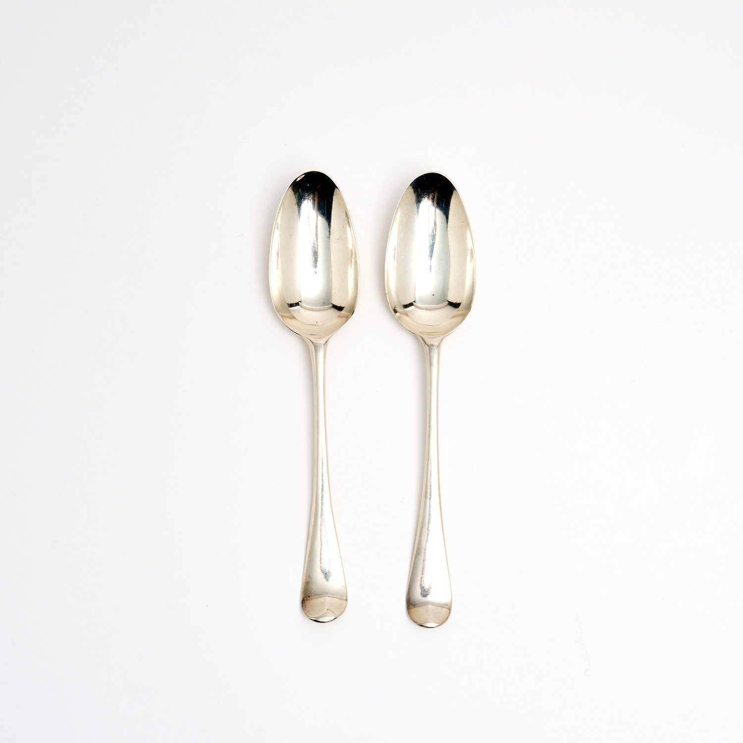 A PAIR OF STERLING SILVER TABLE SPOONS, UNIDENTIFIED MAKER ‘JT', LONDON, MID 18TH CENTURY (MARKS RUBBED), 116G L.20.5CM