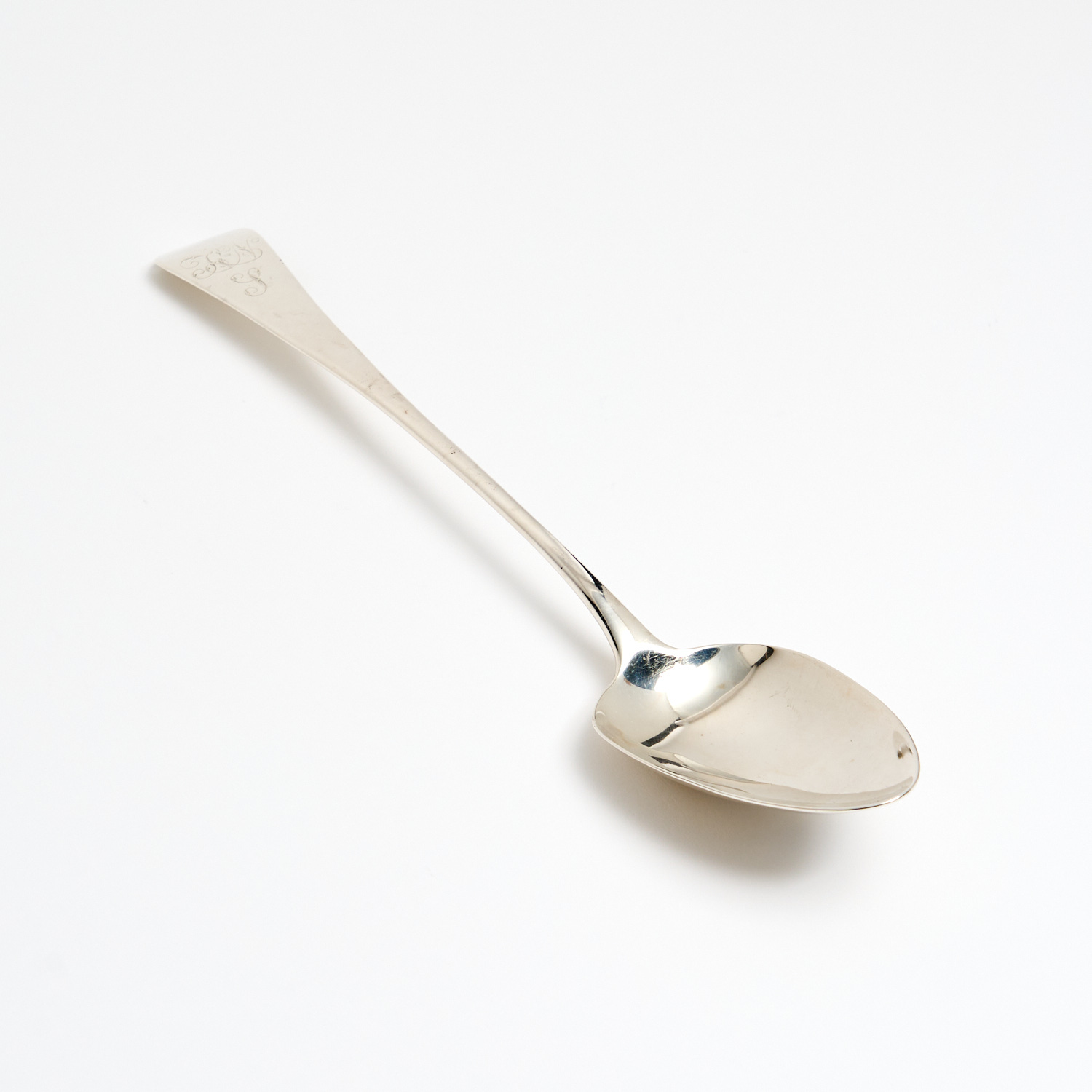 A GEORGE III STERLING SILVER SERVING SPOON, UNIDENTIFIED LONDON MAKE AND DATE (MARKS RUBBED) 109G, L. 30CM