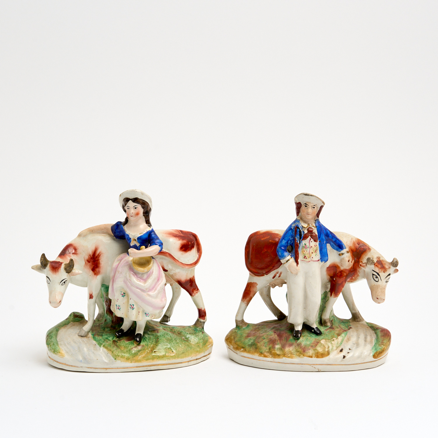 A PAIR OF EARLY VICTORIAN STAFFORDSHIRE POTTERY MILKMAN AND MILKMAID FIGURES H.16.5CM