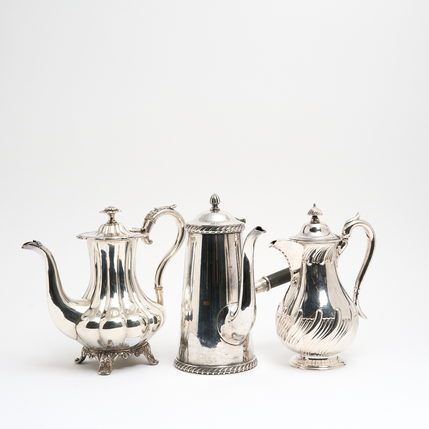 A GROUP OF THREE ASSORTED SILVER PLATE COFFEE POTS IN VARIOUS GEORGIAN STYLES, VARIOUS MAKERS AND 19TH AND 20TH CENTURY DATES
