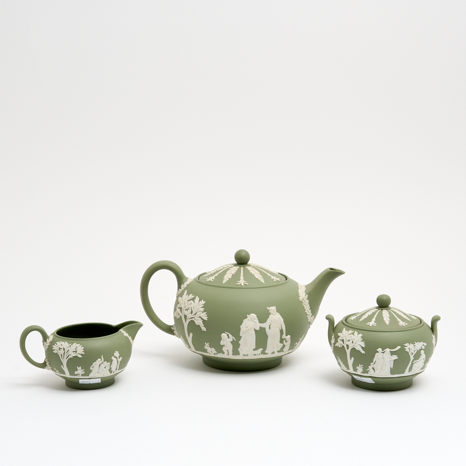 A WEDGWOOD THREEPIECE JASPERWARE TEA SERVICE COMPRISING A TEAPOT, SUGAR BOWL AND CREAMER L.23CM