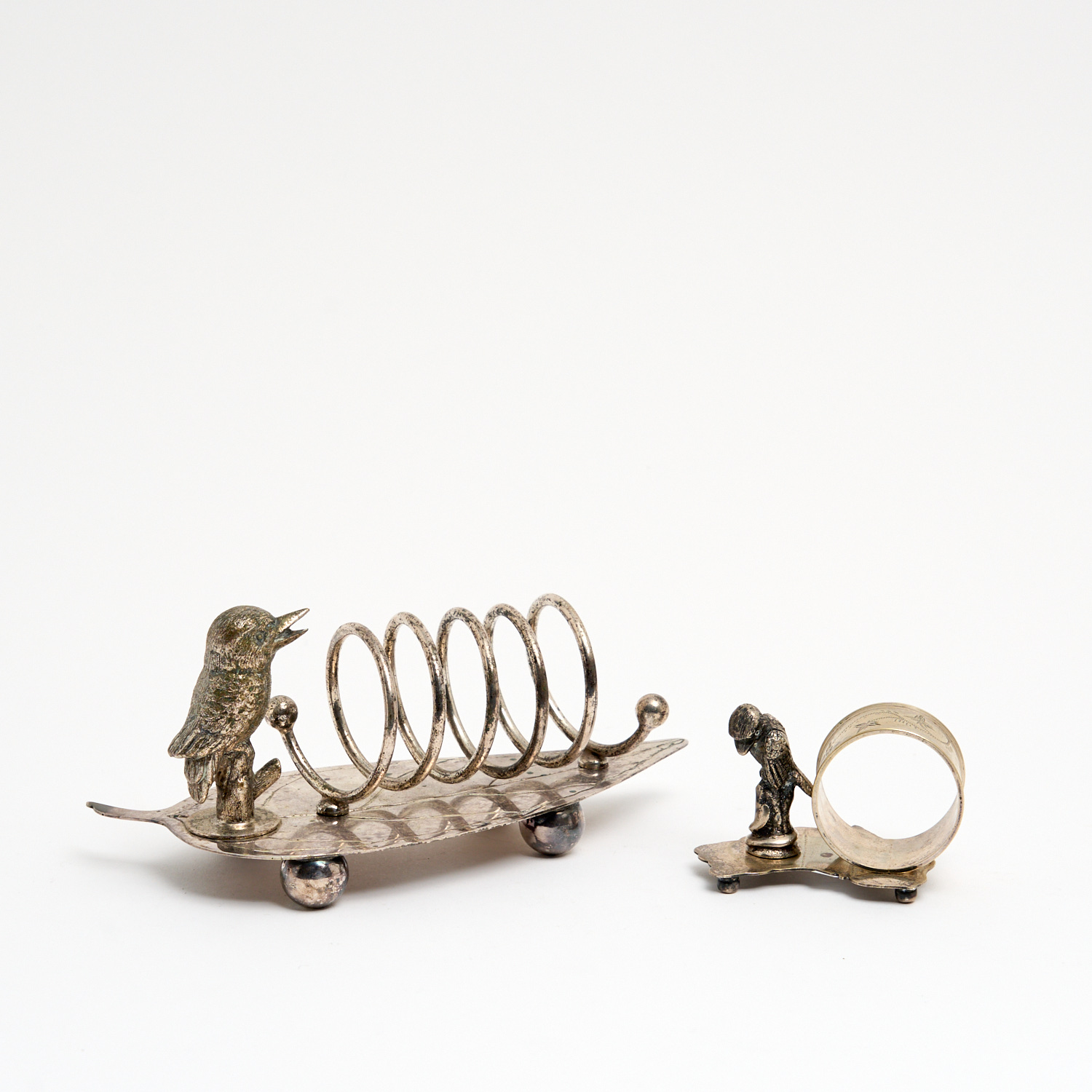 TWO PIECES OF AUSTRALIANA SILVER PLATE INCLUDING A KOOKABURRA TOAST RACK AND NAPKIN RING L.18.5CM (LONGEST)