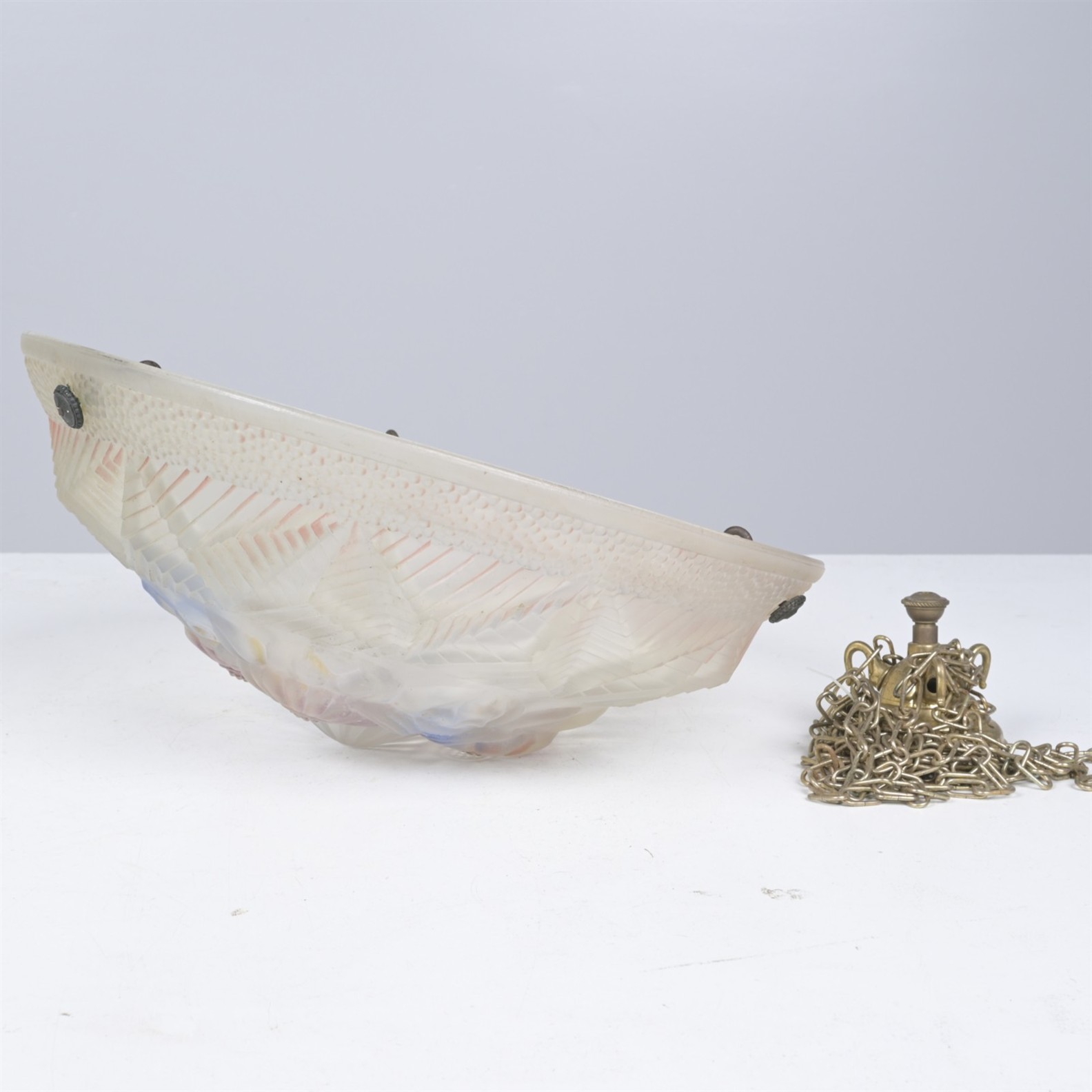 AN ART DECO GLASS PENDANT LIGHT (A/F, CHIP TO GLASS) (38CM DIA)