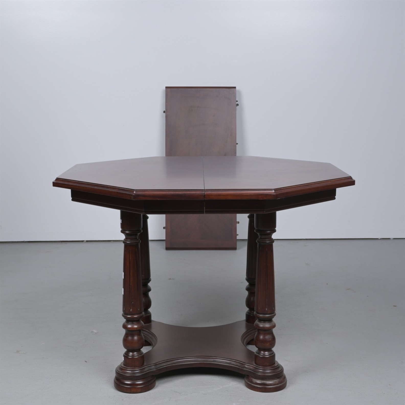 AN OCTAGONAL EXTENDING DINING TABLE (76CM H X 106CM W X 106CM D, CLOSED) (THIS ITEM MUST BE REMOVED BY PROFESSIONAL CARRIERS OR CLIENTS. LEONARD JOEL STAFF CANNOT ASSIST WITH CARRYING OR DELIVERY OF THIS ITEM)
