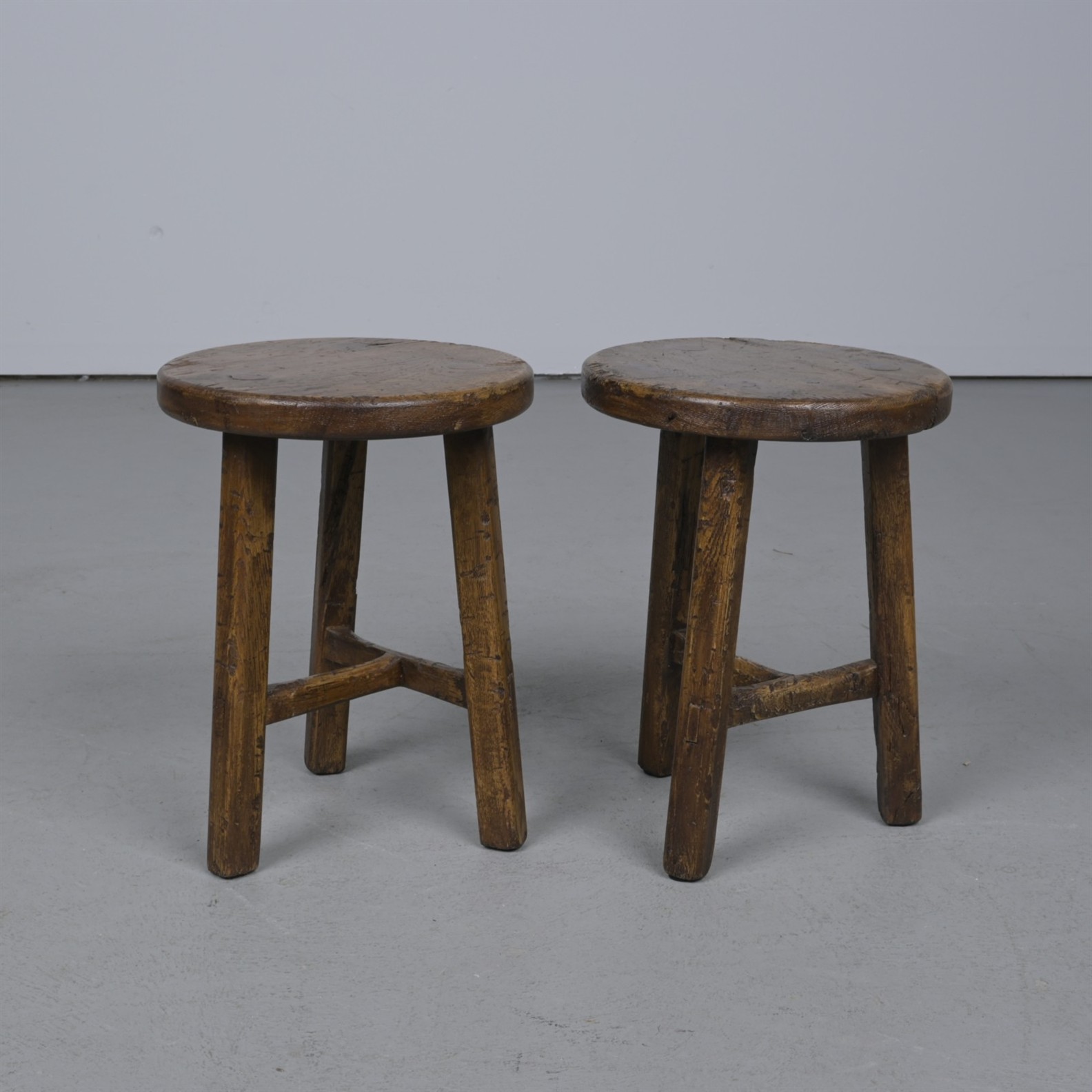 A PAIR OF ANTIQUE-STYLE OAK STOOLS (41CM H X 31CM DIA)