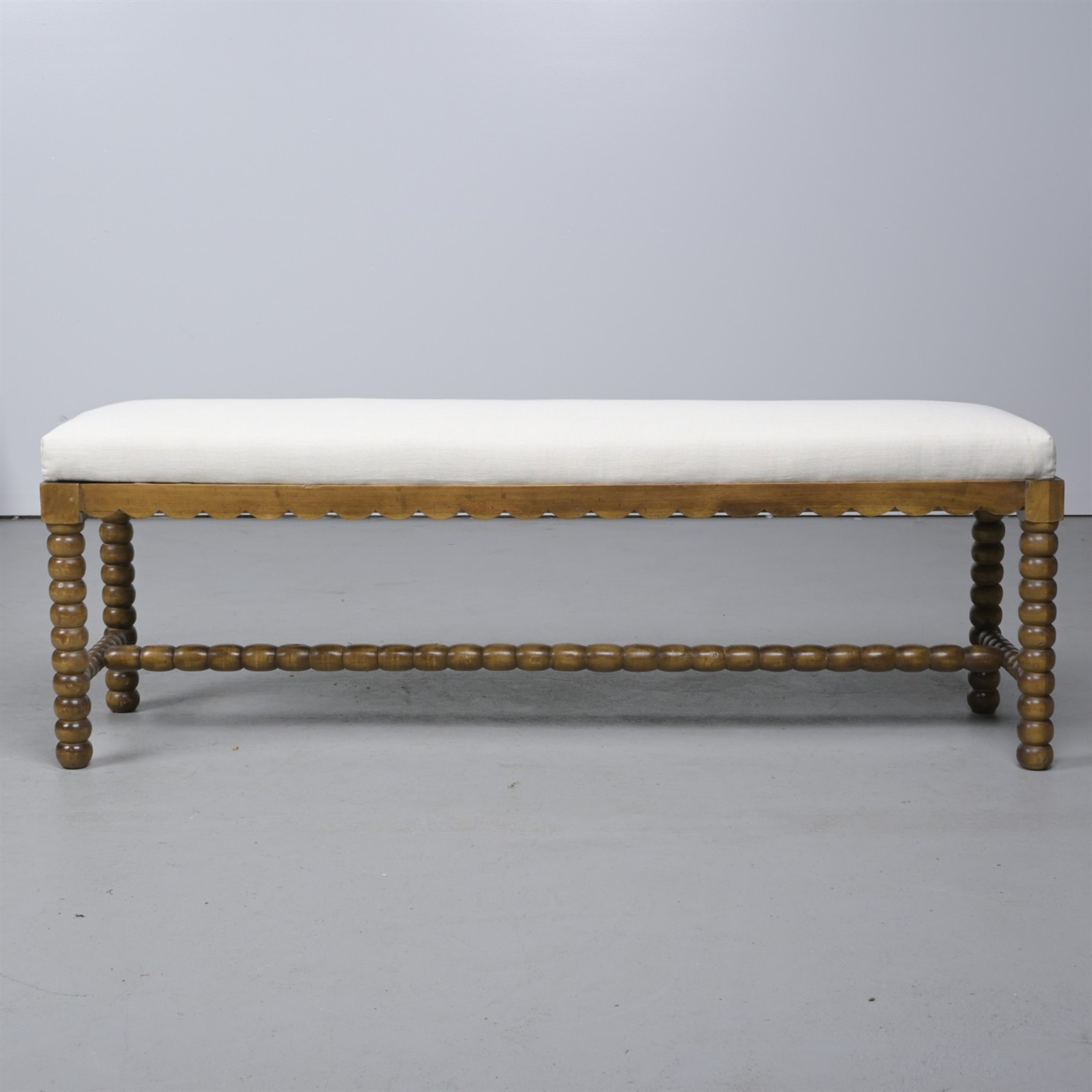 A BOBBIN-TURNED AND UPHOLSTERED LONG STOOL (54CM H X 155CM W X 41CM D)