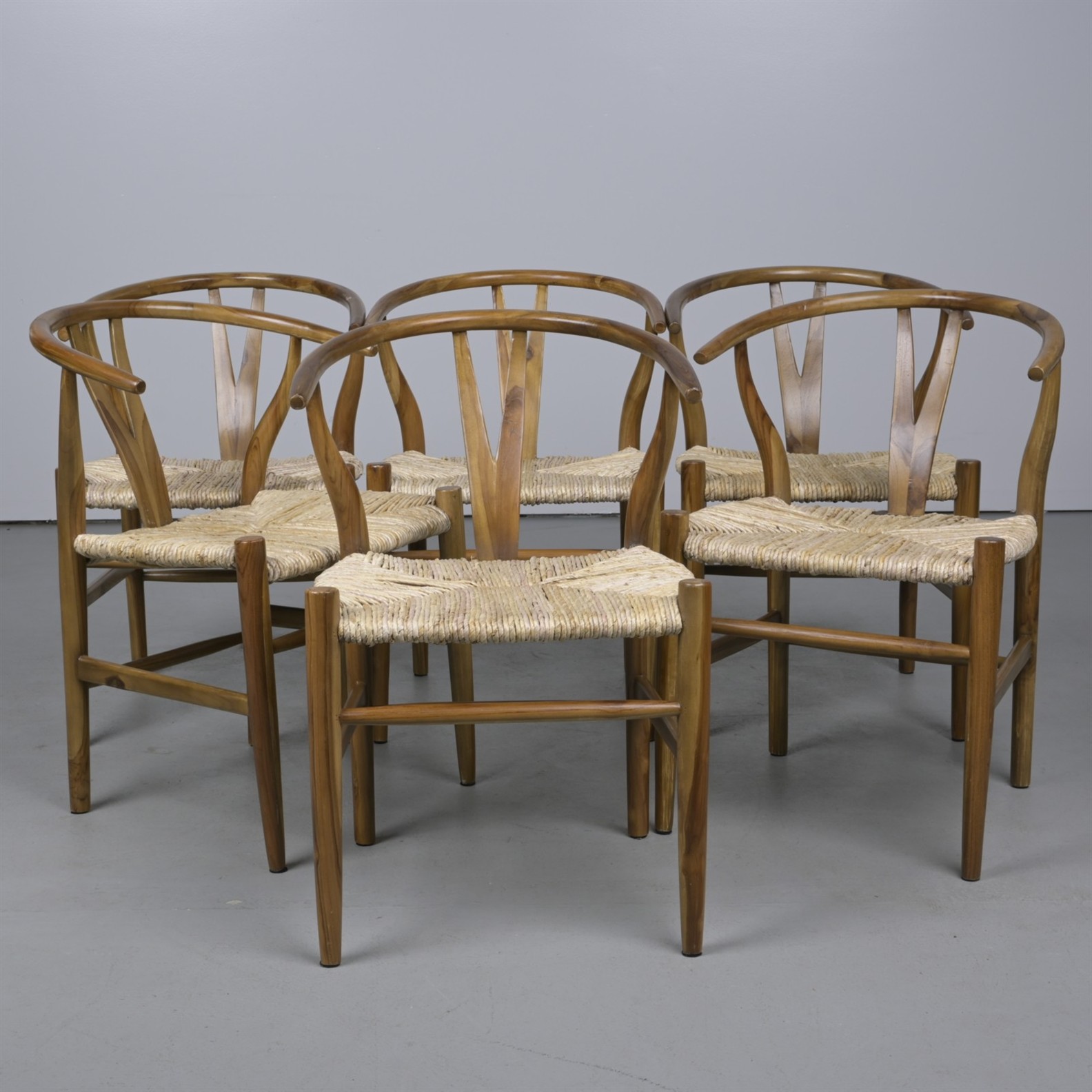A SET OF SIX WISHBONE-STYLE CHAIRS WITH RUSH SEATS (80CM H X 55CM W X 56CM D)