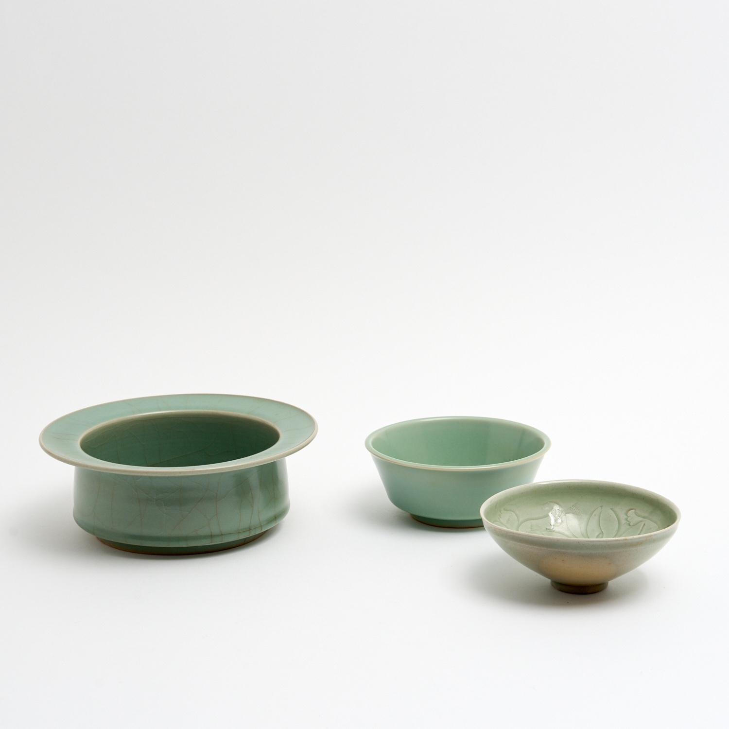 THREE CHINESE CELADON BOWLS INCLUDING ONE WITH A CRACKLE GLAZE DIA.21CM (LARGEST)