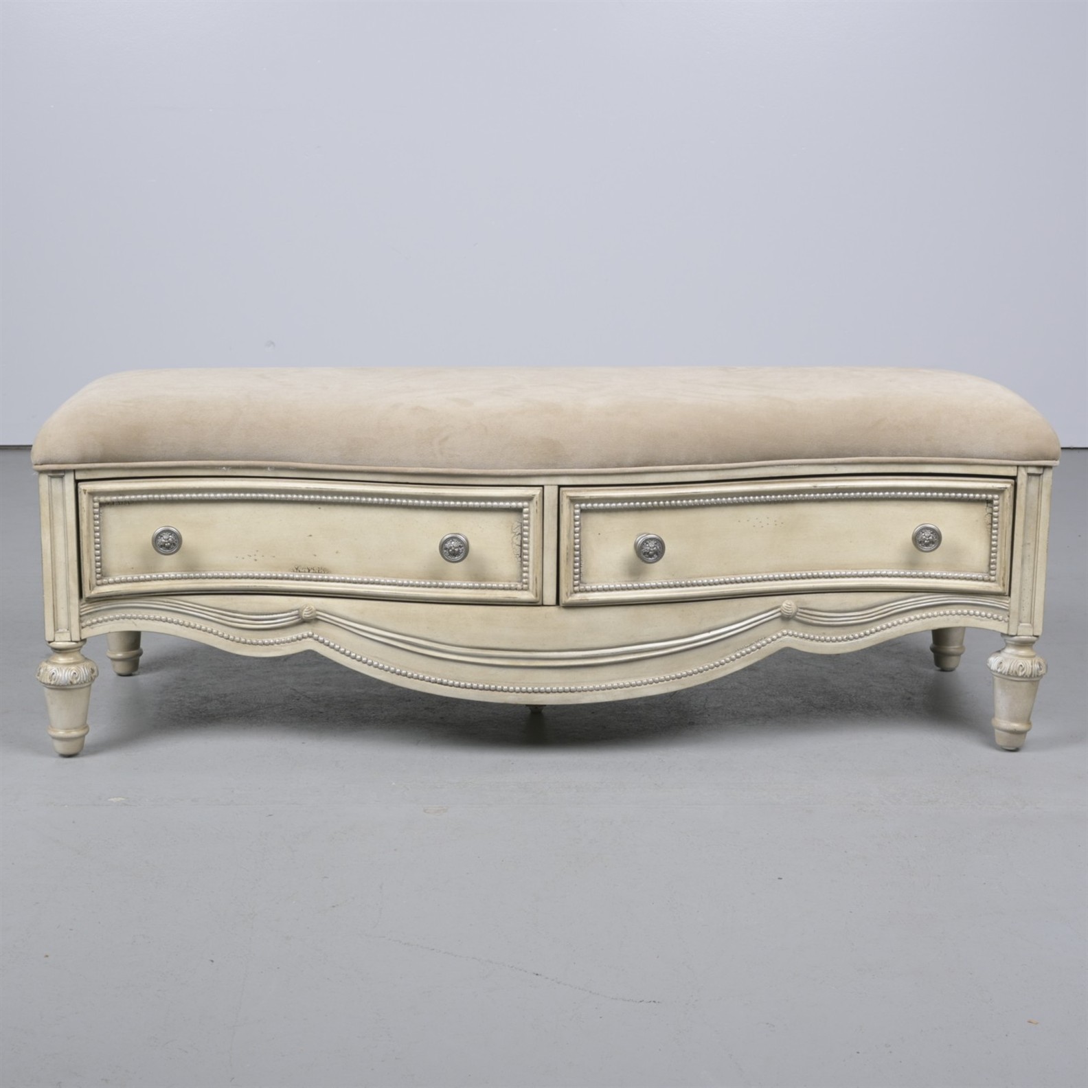 AN UPHOLSTERED OTTOMAN IN ANTIQUE MANNER (50CM H X 138CM W X 50CM D) (THIS ITEM MUST BE REMOVED BY PROFESSIONAL CARRIERS OR CLIENTS. LEONARD JOEL STAFF CANNOT ASSIST WITH CARRYING OR DELIVERY OF THIS ITEM)