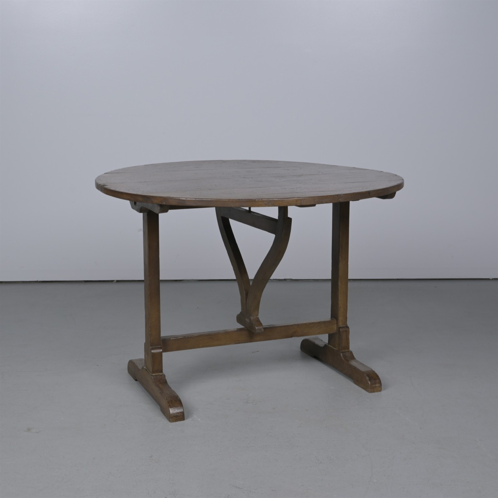 AN ANTIQUE-STYLE OAK VENDAGE TABLE (75CM H X 105CM DIA) (THIS ITEM MUST BE REMOVED BY PROFESSIONAL CARRIERS OR CLIENTS. LEONARD JOEL STAFF CANNOT ASSIST WITH CARRYING OR DELIVERY OF THIS ITEM)