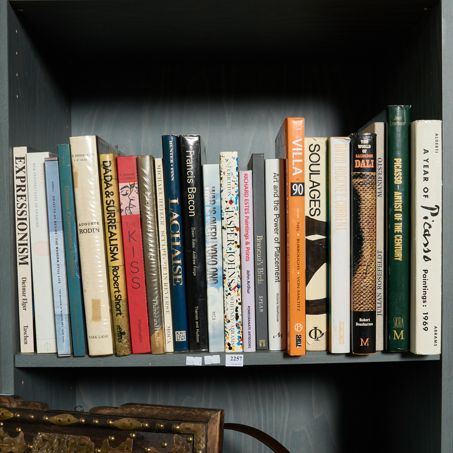 A SHELF OF 20TH CENTURY ART REFERENCE INCLUDING YOKO ONO 'WAR IS OVER' (SIGNED BY YOKO ONO), LUCIEN FREUD, FRANCIS BACON, PICASSO AND DALI